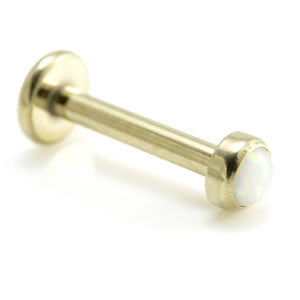 Gold PVD Coating on Titanium Opal Gem Disk Labret Sizes: 1.2mm x 6/7/8/9/10mm Disk Size: 3mm or 4mm Opal Colour: White Labret Base: 4mm Medical Grade Titanium 6Al-4VEli ASTM:F-136