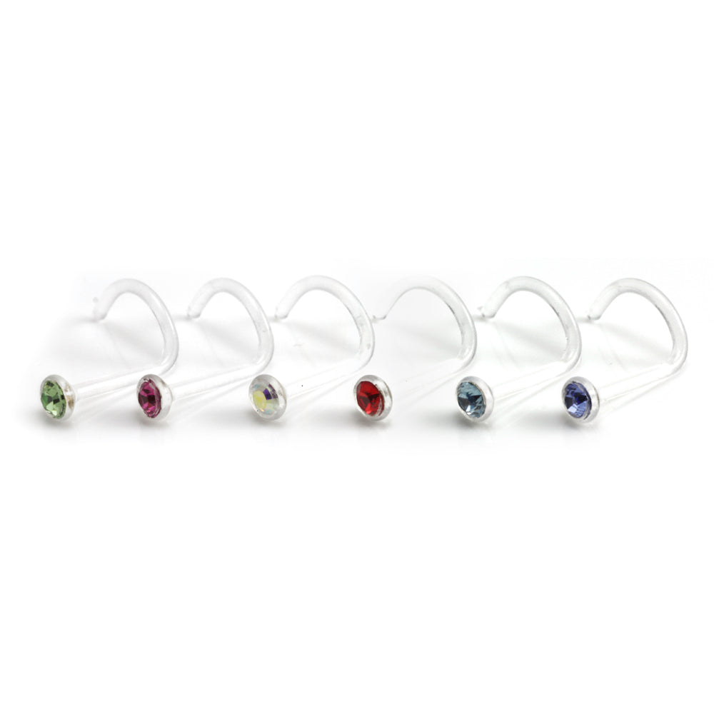 Clear Bioplast Nose Stud Gems not to be autoclaved Gauge: 0.8mm Bioplast: Clear Gem Colours: Aqua, Amethyst, Blue Zircon, Crystal, Fuchsia, Lt Rose, Lt Siam, Sapphire, Peridot