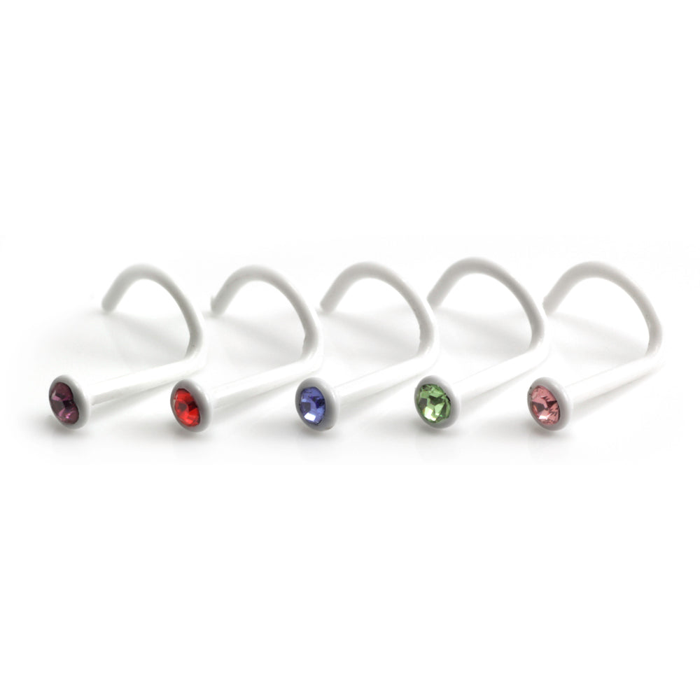 White Bioplast Nose Stud Gems not to be autoclaved Gauge: 0.8mm Bioplast: White Gem Colours: Aqua, Amethyst, Blue Zircon, Crystal, Fuchsia, Lt Rose, Lt Siam, Sapphire, Peridot