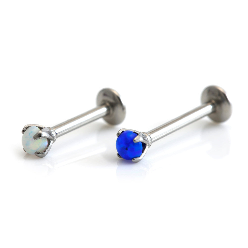Synthetic Opal Claw Set Gem on Internal Thread Steel Labret Size: 1.2mm x 6,7,8,10mm Colours: White or Blue