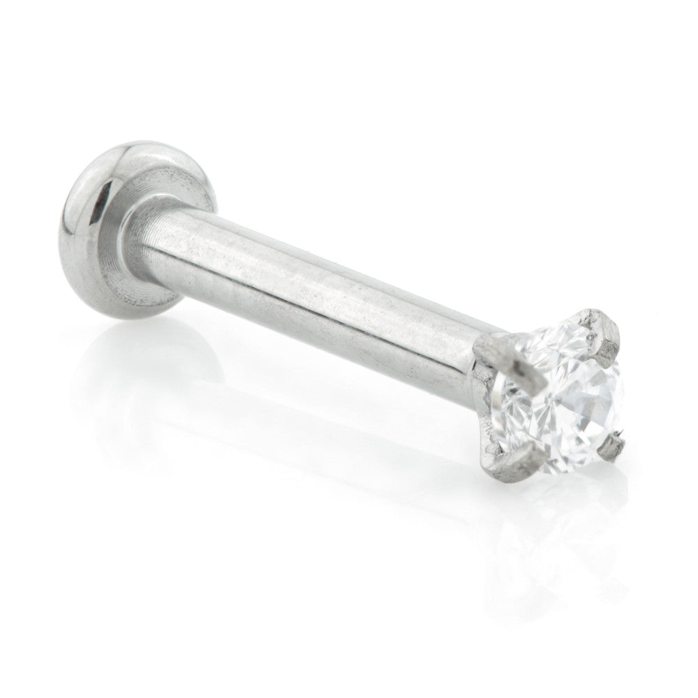 Titanium Small Base Labret with Prong Gem Attachment 1.0mm (threadless)Labret Sizes: 8mmGem Size: 2mm or 3mm Gem Colour: CrystalFits all POP's Medical Grade Titanium 6Al-4VEli ASTM:F-136