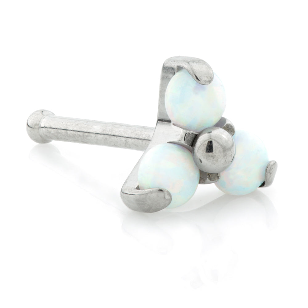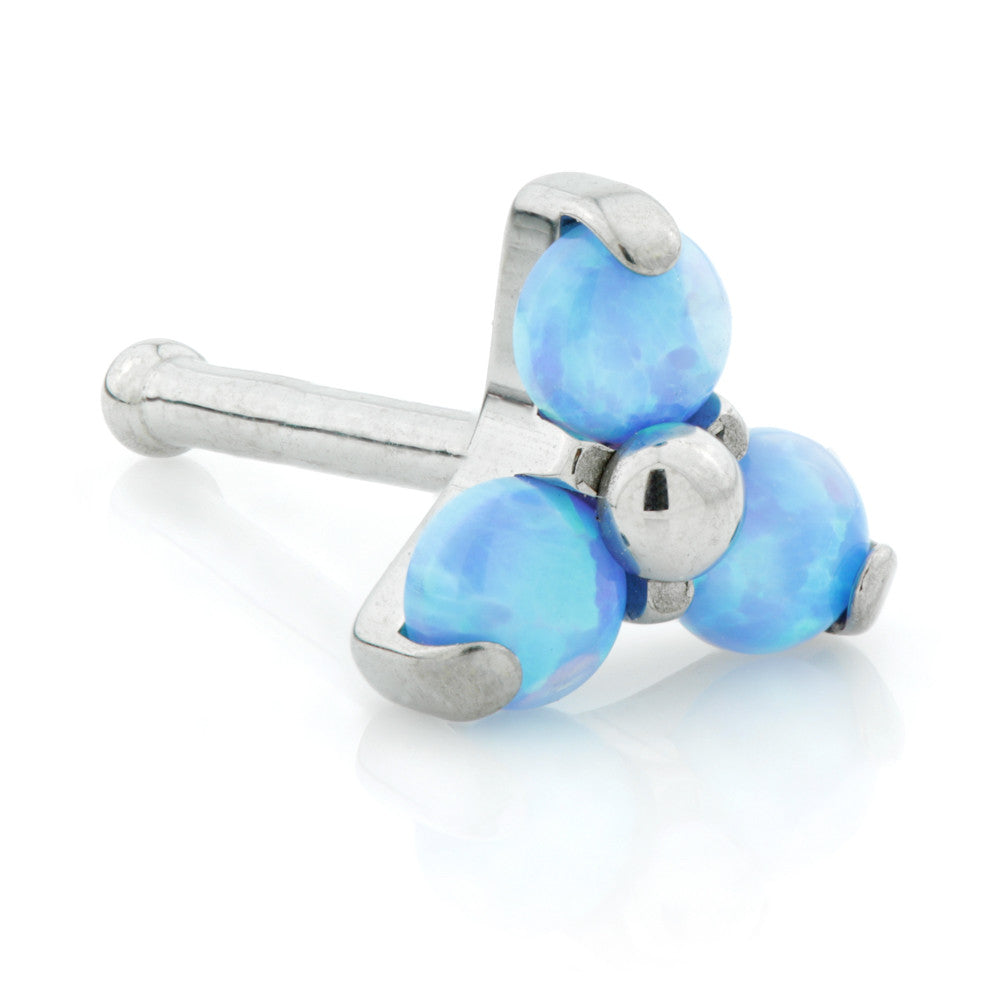 Ti Trinity Opal Straight Nose Stud Gauge: 0.8mm Length: 8mm Trinity Size: 5mm Opal Colour: White or Blue Medical Grade Titanium 6Al-4VEli ASTM:F-136
