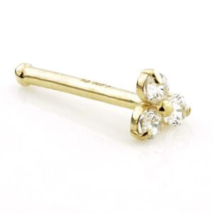 TISH LYON® 14ct Gold Trinity Gem Nose Stud Stud thickness: 0.8mm Gem Trinity Diameter: 3mm (with 3 gems) Gem Size: 1mm or 1.5mm Nose Bar: 8mm Ball End: 1mm Gold Colour: Yellow or White Laser Mark - 14K TL