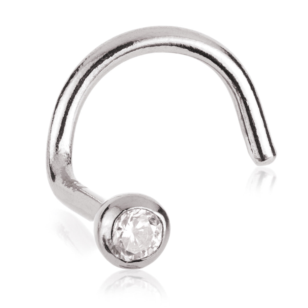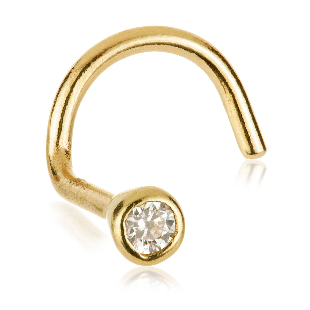 TISH LYON® TL - Gold Bezel Gem Nose Stud </br> </p> Gauge: 0.8mm Gem Size: 1.5mm / 2mm </br> Gold Colour: Yellow / White </br> Gem Colour: Crystal </br> Carat: 14ct </br> CZ Gem Stones </br> </p> Packaged in small grey presentation box </br> Suitable for initial piercing </p>