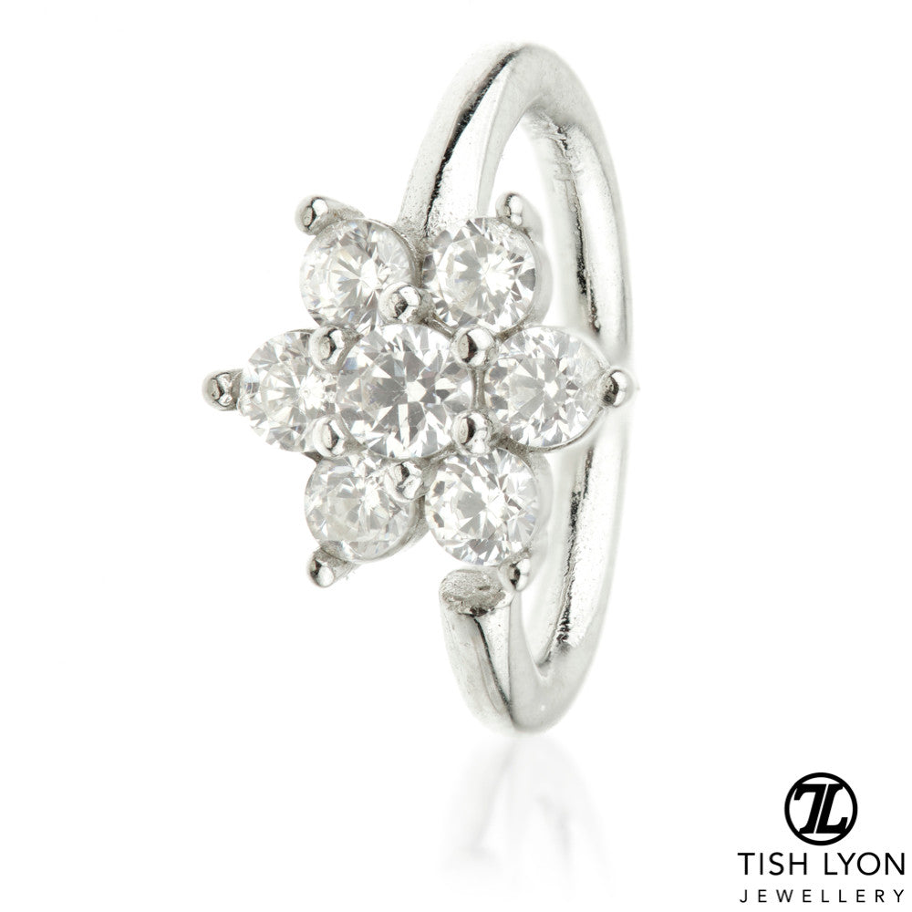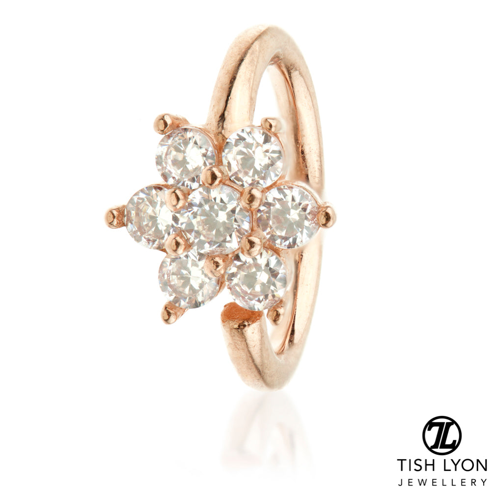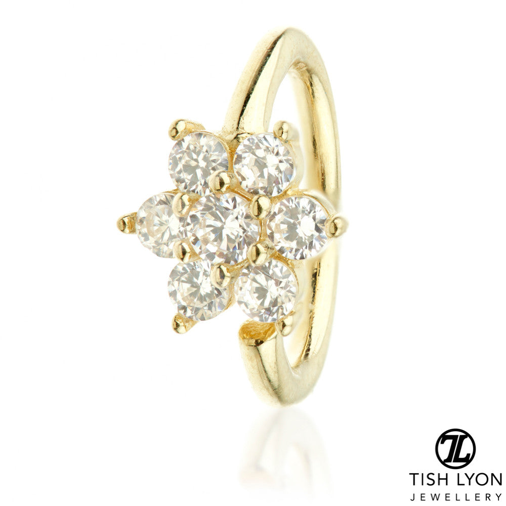 TISH LYON® - Gem Flower Seamless Twist Ring 9ct or 14ct Yellow Gold CZ Crystal Gems Size: 1mm or 1.2mm x 8mm For Nose, Cartilage, Tragus, etc 14ct Suitable for initial piercing Be gentle and do not over twist as this can pull the design out of shape