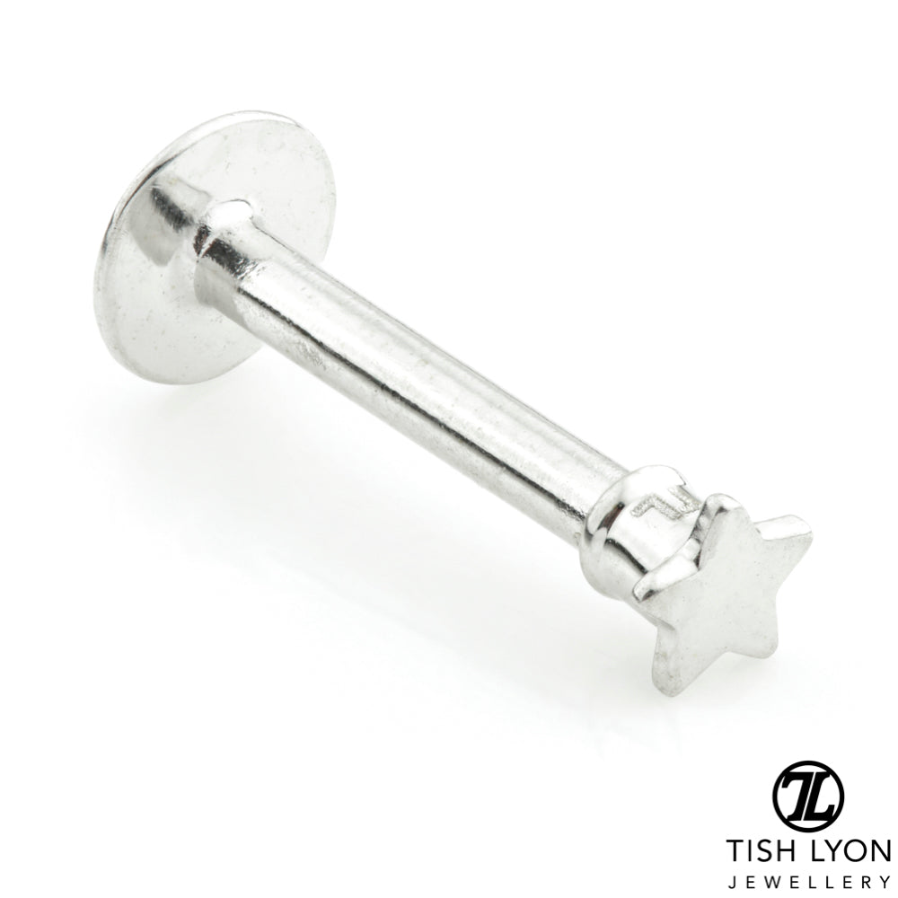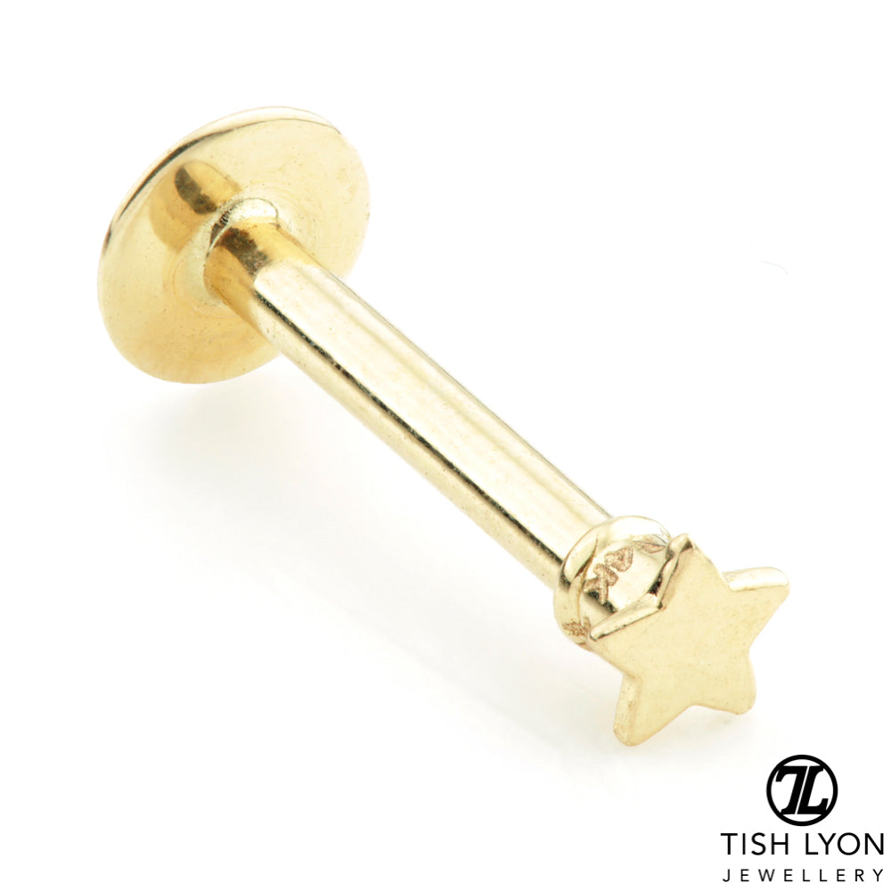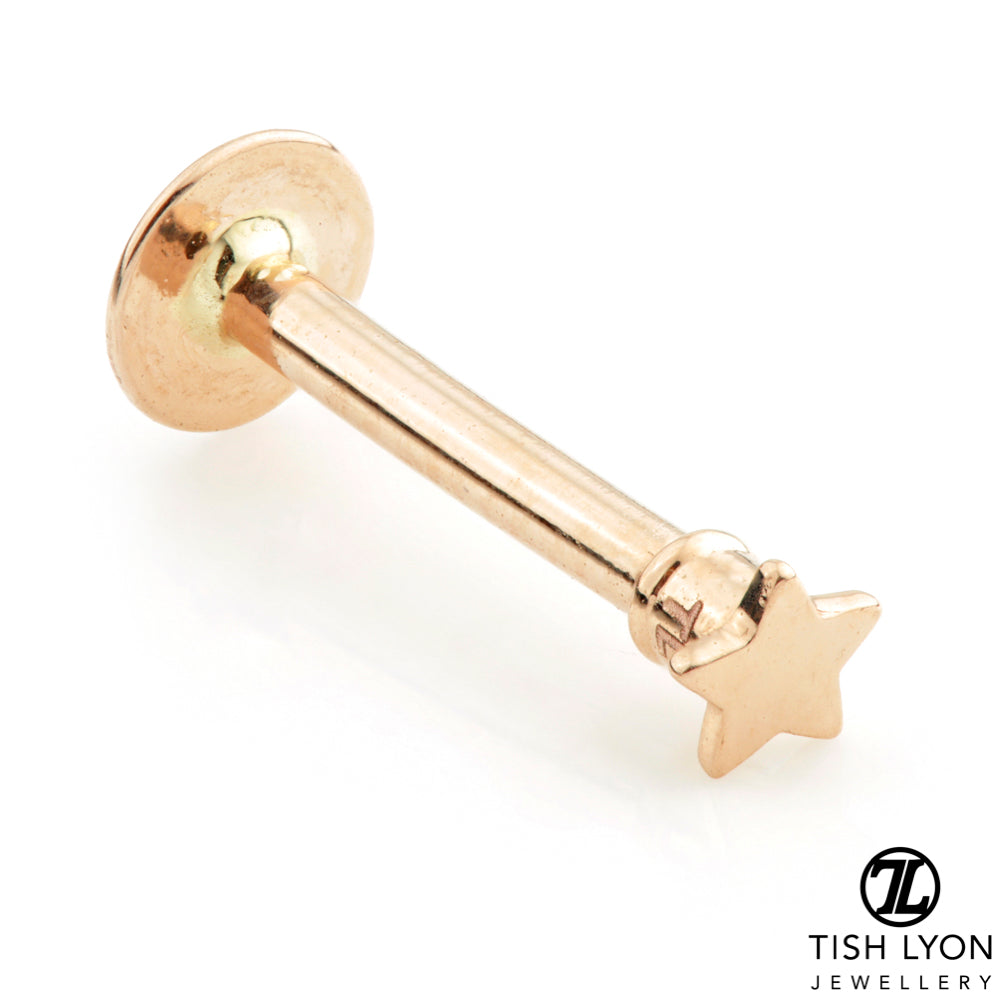 TISH LYON® 14ct Gold Star Micro Labret (external thread) Gold: Yellow, White or Rose Star Size: 2.5mm Size: 1.2mm x 8mm Round Base: 4mm Suitable for initial piercing Laser Stamp 14K & TL (on top not bar)