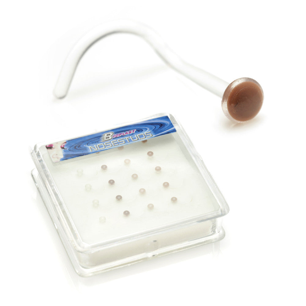 Clear, Light Flesh, Medium Flesh, Dark Flesh on Clear Bioplast Nose Stud Retainers in a clear box Holds 20 nose studs Gauge: 0.8mm