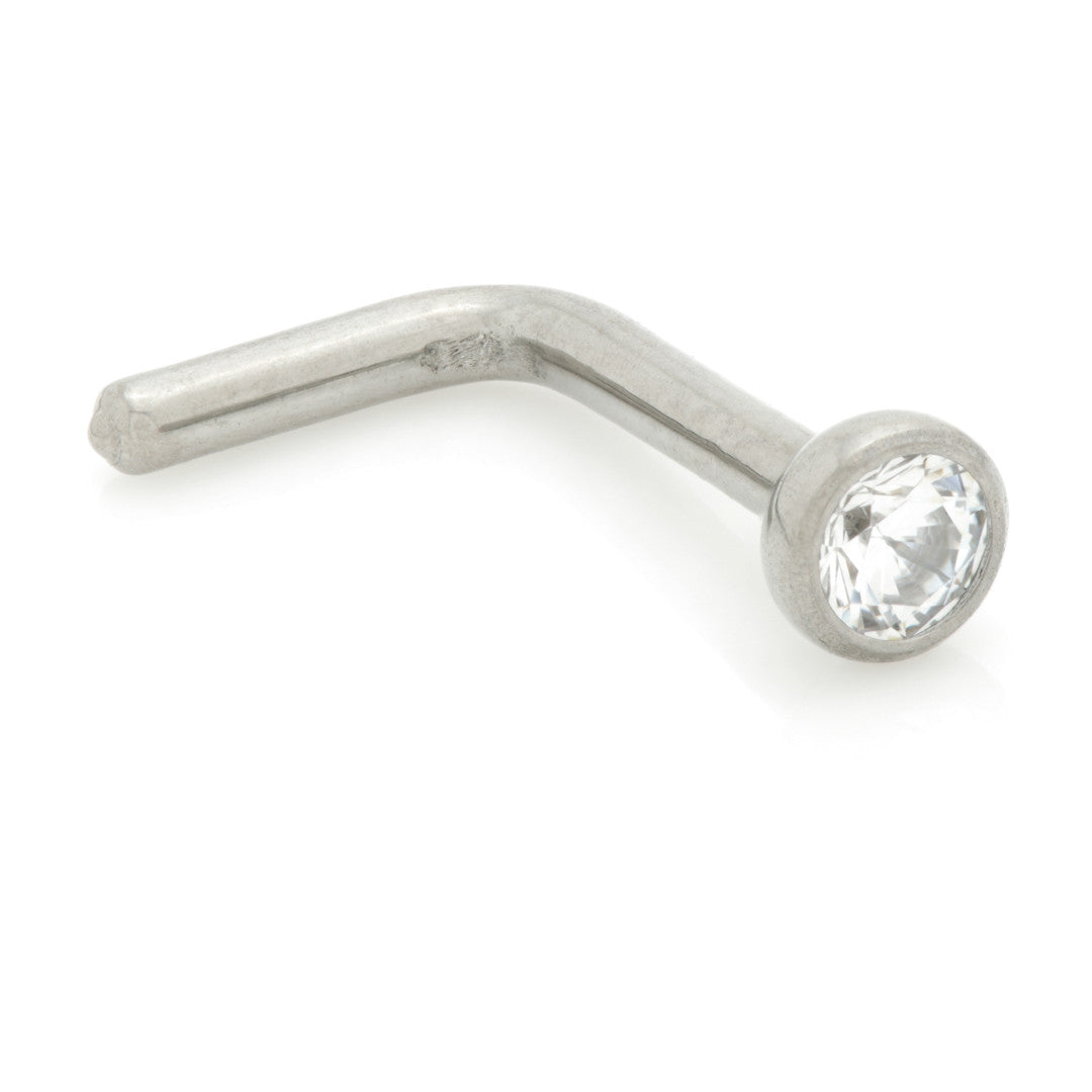 Titanium Jewelled L Shape Nose Stud Gauge: 1mm Ball Size: Crystal = 2.5mm / Fuchsia = 2mm Gem Colour: Crystal / Fuchsia Medical Grade Titanium 6Al-4VEli ASTM:F-136