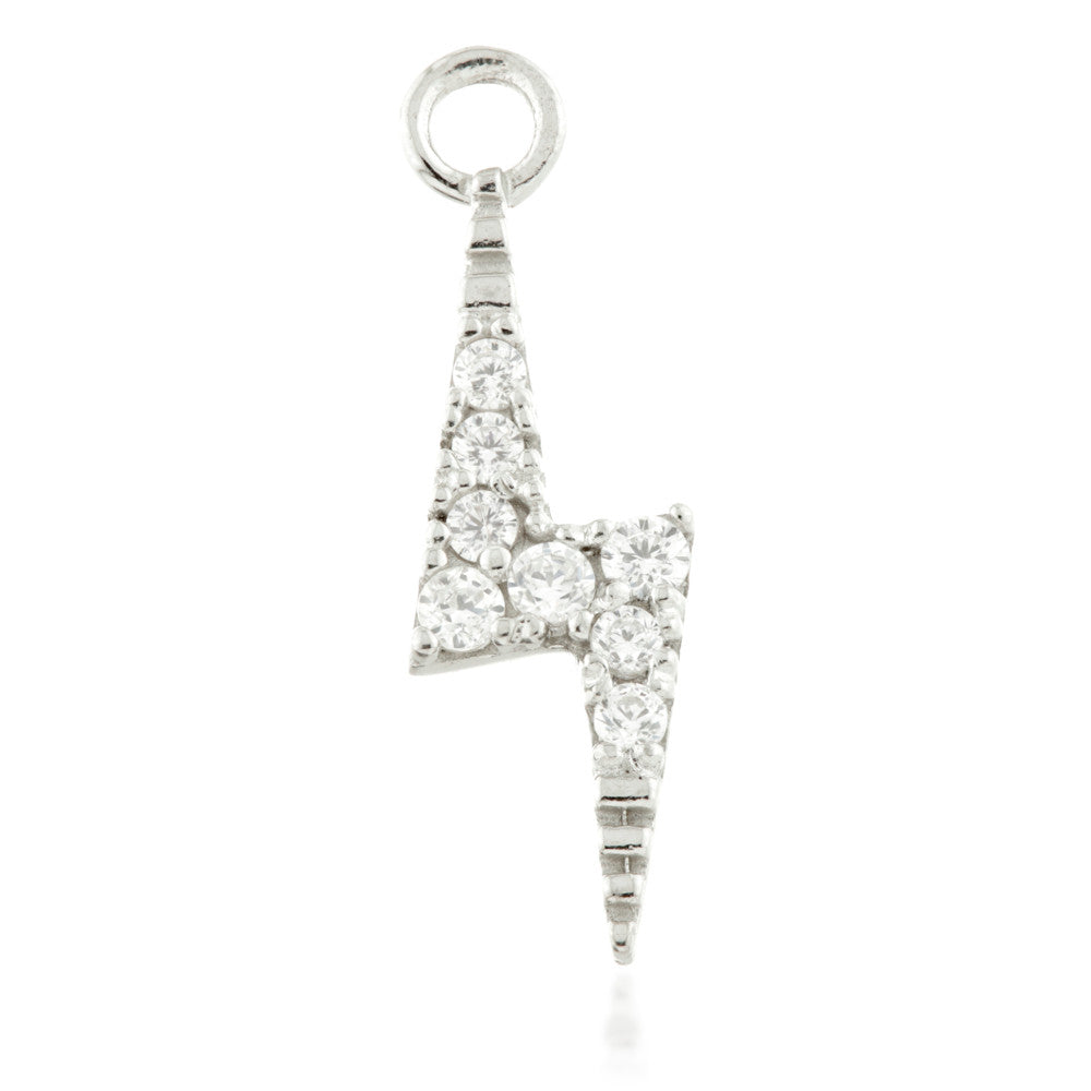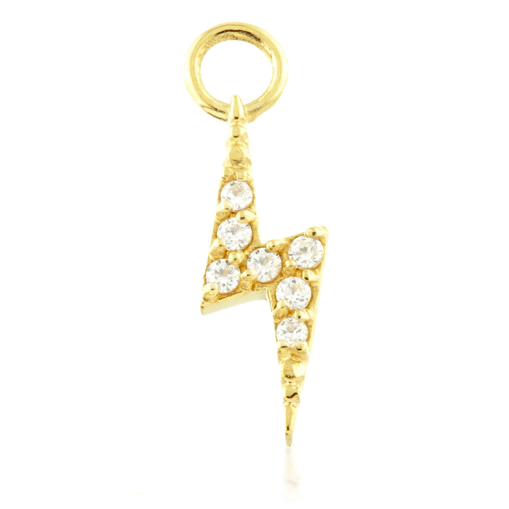 TISH LYON® 9ct Gold Lightning Bolt Charm for Hinge Segment Ring/BCR Colour: Yellow or White Size: 12mm x 4mm O-ring Inner Diameter: 1.8mm O-ring Gauge: 0.46mm CZ Size: 1mm(x5), 1.2mm (x3) Laser Mark