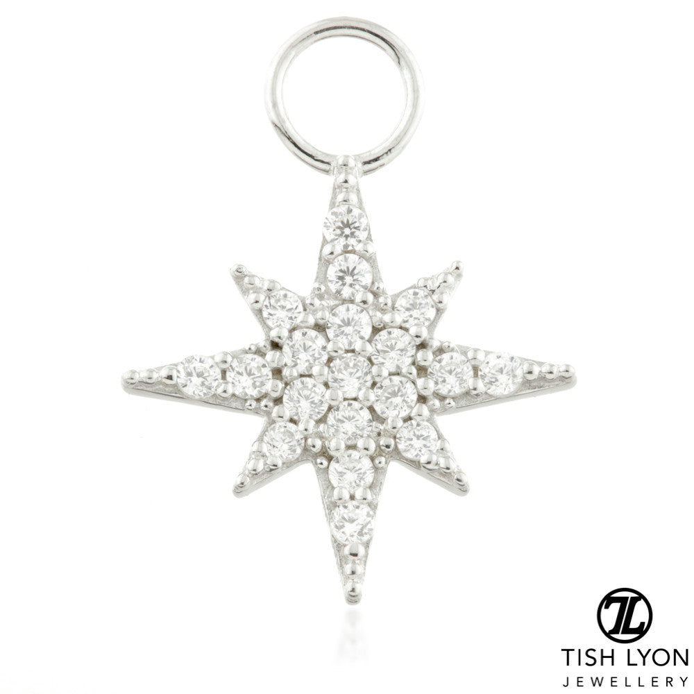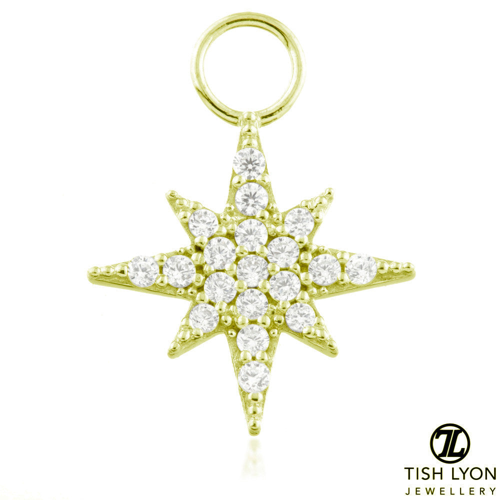 TISH LYON® 9ct Gold Jewelled North Charm for Hinge Rings Colour: Yellow or White Size: 10x10mm Weight: 0.5gm O-ring Inner Diameter: 2.6mm O-ring Gauge: 0.45mm Laser Mark