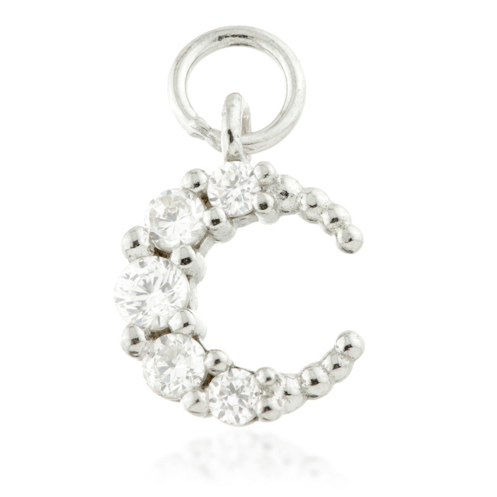 TISH LYON® 9ct Gold Small Jewelled Moon Charm for Hinge Rings Colour: Yellow or White Size: 6mm x 2mm Weight: 0.25gms O-ring Inner Diameter: 2mm O-ring Gauge: 0.45mm CZ Size: 1.1mm (x2), 1.3mm (x2), 1.5mm (x1) Laser Mark 9K TL