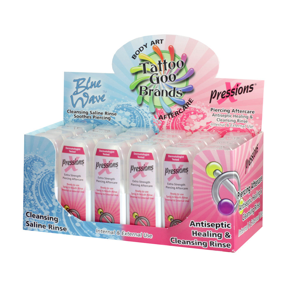 Antibacterial and Antimicrobial Spray. Pack of 24 x 2oz bottles From Tattoo Goo For internal and external piercings! A new ready to use CPC- MSM Complex formula. X-pression Piercing aftercare contains Cet-C, a powerful anti-bacterial and anti-microbial. Cet-C is effective against Staph aureus, E. coli, Candida albicans, Aspergullis niger and Pityrosporum ovale. Water based and contains no alcohol that can burn new piercings. Has a pleasant flavouring which provides for no bitter aftertaste.