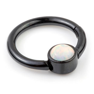 Black PVD on Steel Hinge Segment Ring with Flat Opal Disk - ideal for Smiley Piercing and ears. Size: 1.2mm x 8mm Disk Size: 4mm Colour: White