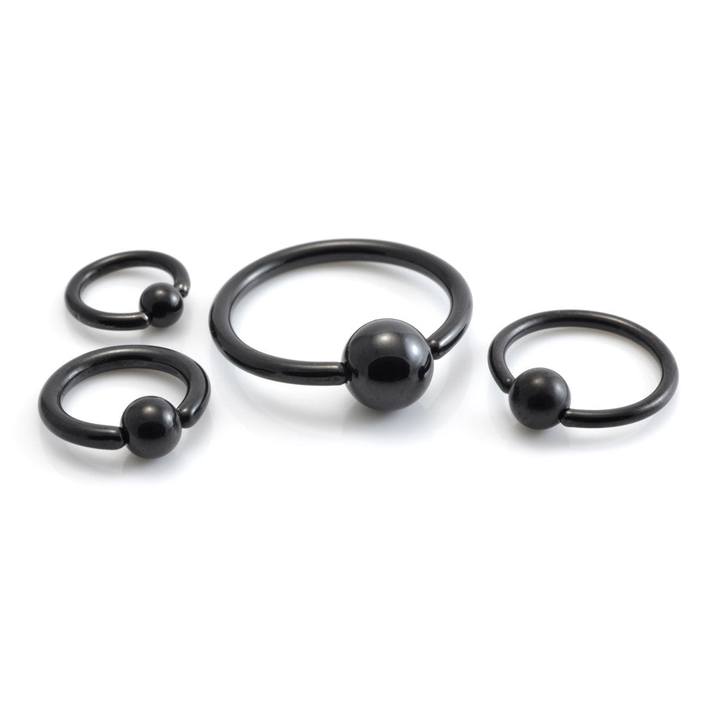 PVD Black on Titanium BCR with Evil Black Ti Ball - Blackest Black Gauge: 1.0mm / 1.2mm / 1.6mm Sizes: 6/7/8/10/12/14/16/18mm Ball size as standard Medical Grade Titanium 6Al-4VEli ASTM:F-136