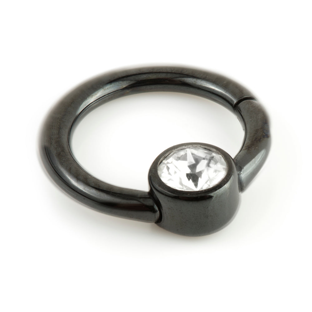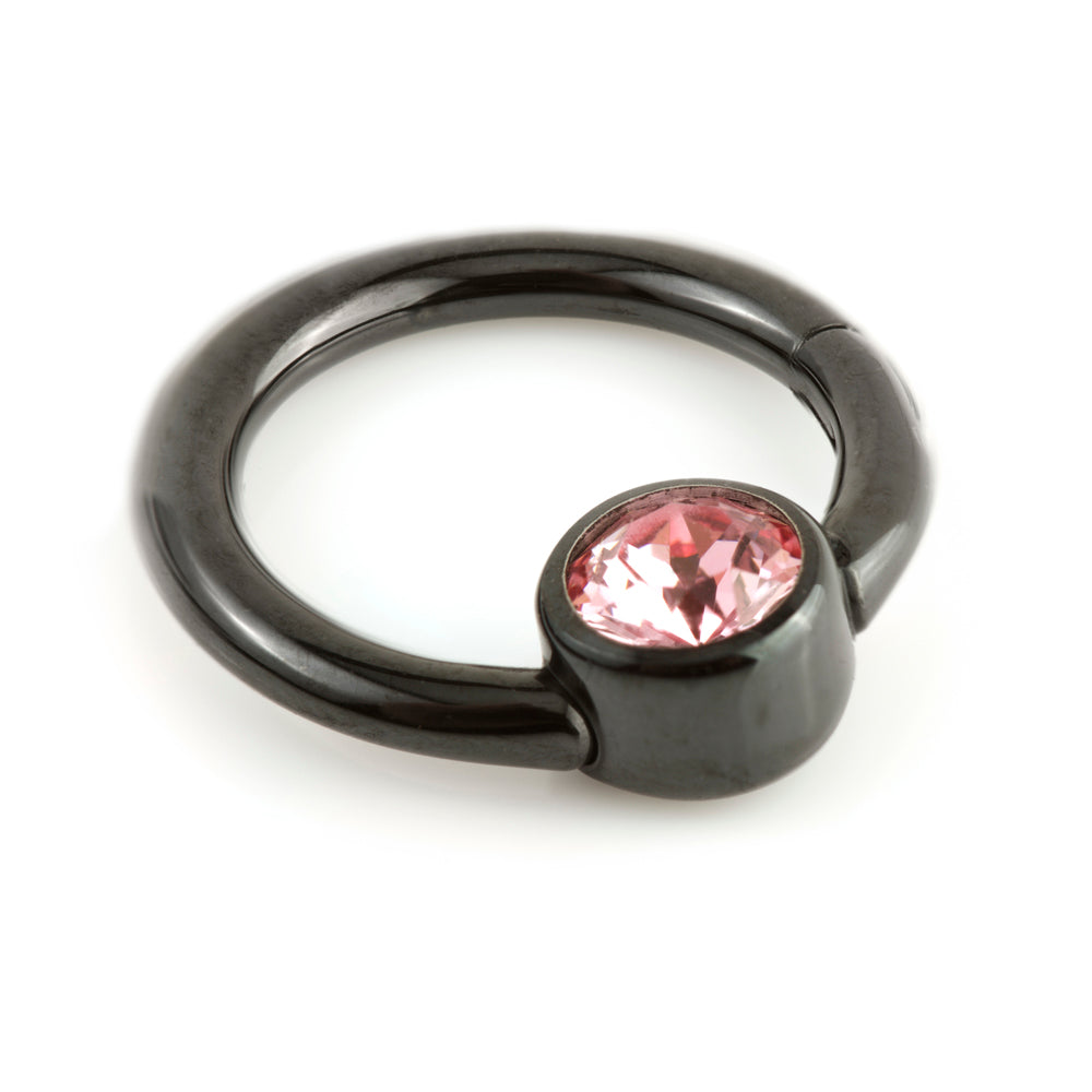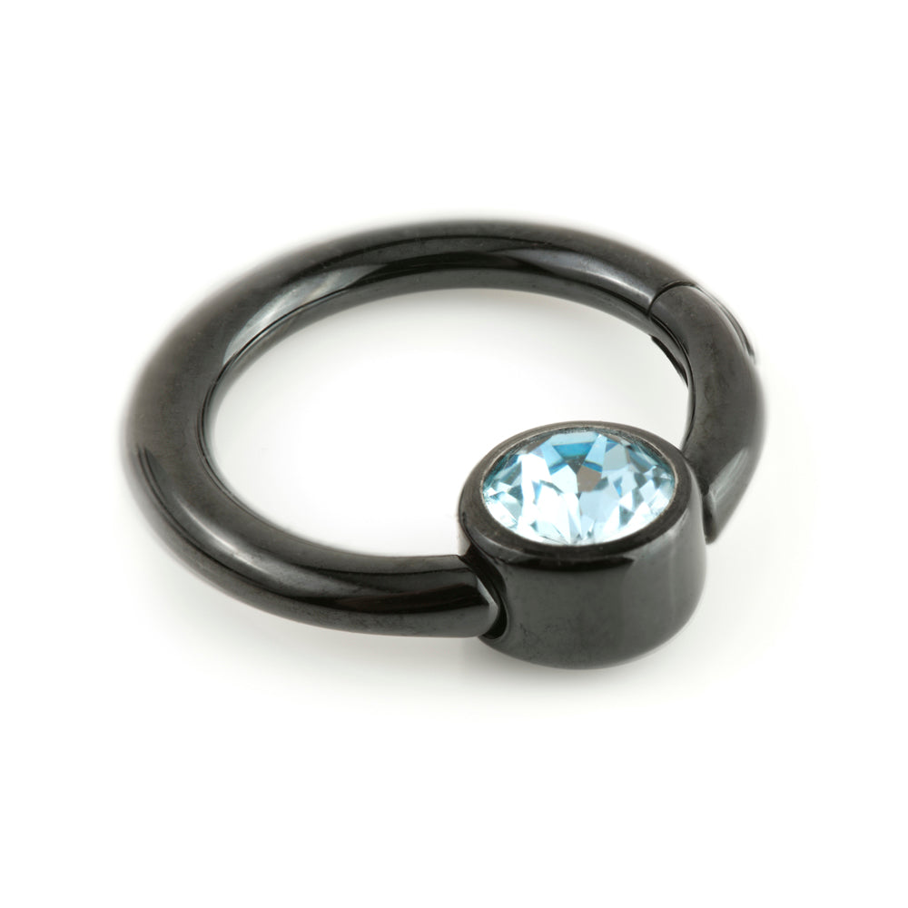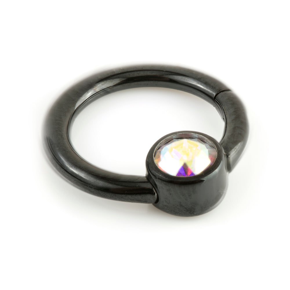 Black PVD on Titanium Hinge Gem Ring Gauge: 1.2mm Size: 8mm Gem Size: 4mm Gem Colour: Crystal, AB, Lt Rose, Aqua