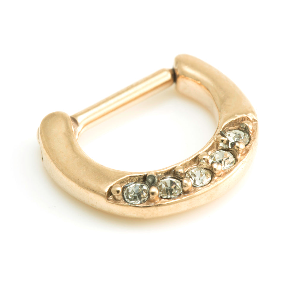<p>Rose Gold PVD on 316L Steel Hinged Septum Ring</p> <p>Sizes: 1.2mm x 6/8mm<br> Crystal Gems</p>