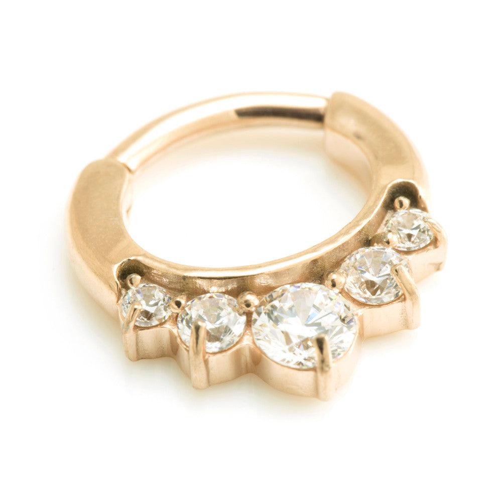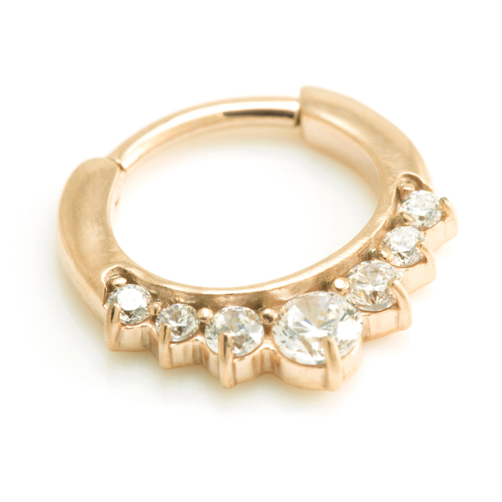 Rose Gold PVD 7 Swarovski Gems in 316L Steel Hinged Septum Ring Sizes: 1.2mm x 6/8mm, 1.6mm x 6mm Gem Colours: Crystal