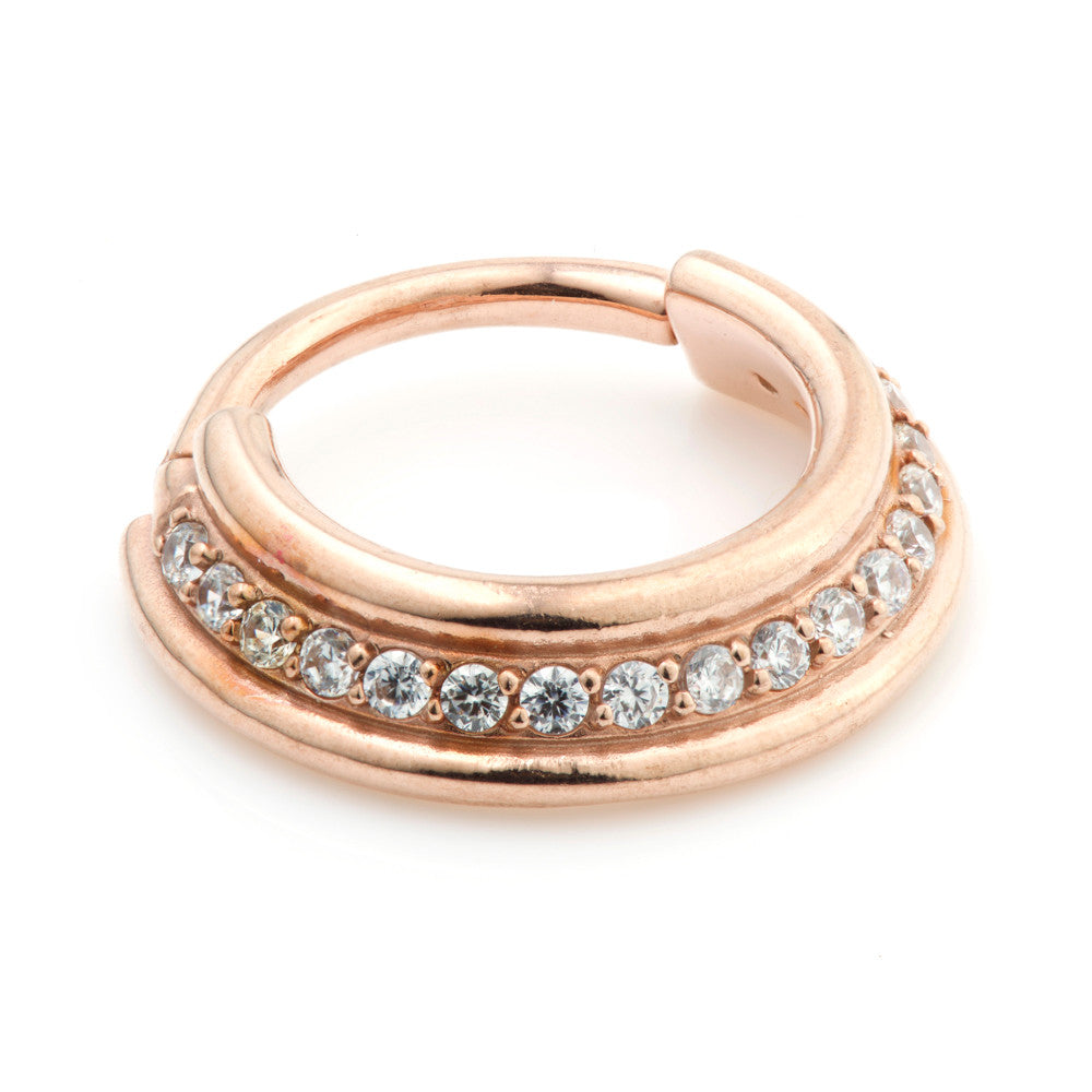 <p>Rose Gold Steel Hinge Graduated Multi Gem Ring</p> <p>Gauge: 1.2mm<br> Size: 8mm or 10mm<br> Gem Colour: Crystal</p>