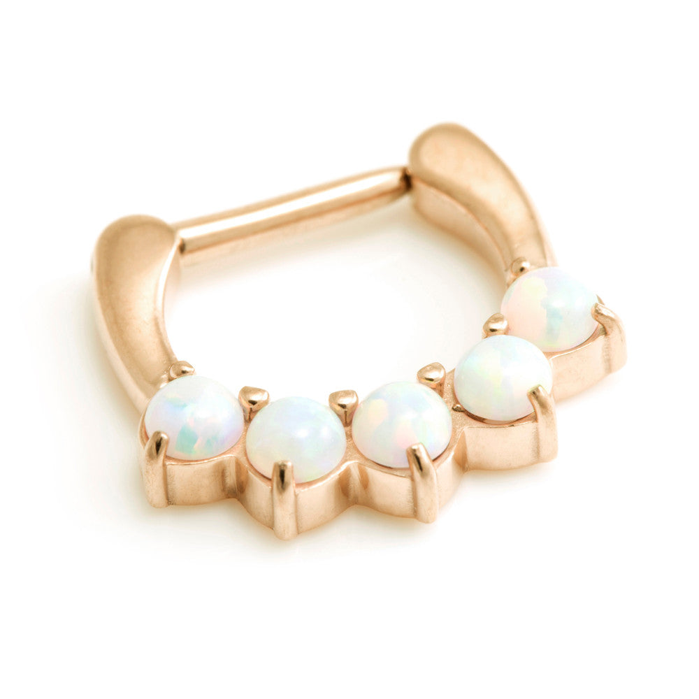 Rose Gold PVD on 316L Steel Hinged Septum Ring Sizes: 1.2/1.6mm x 6mm (5 opals) or 8mm (7 opals) White Opal