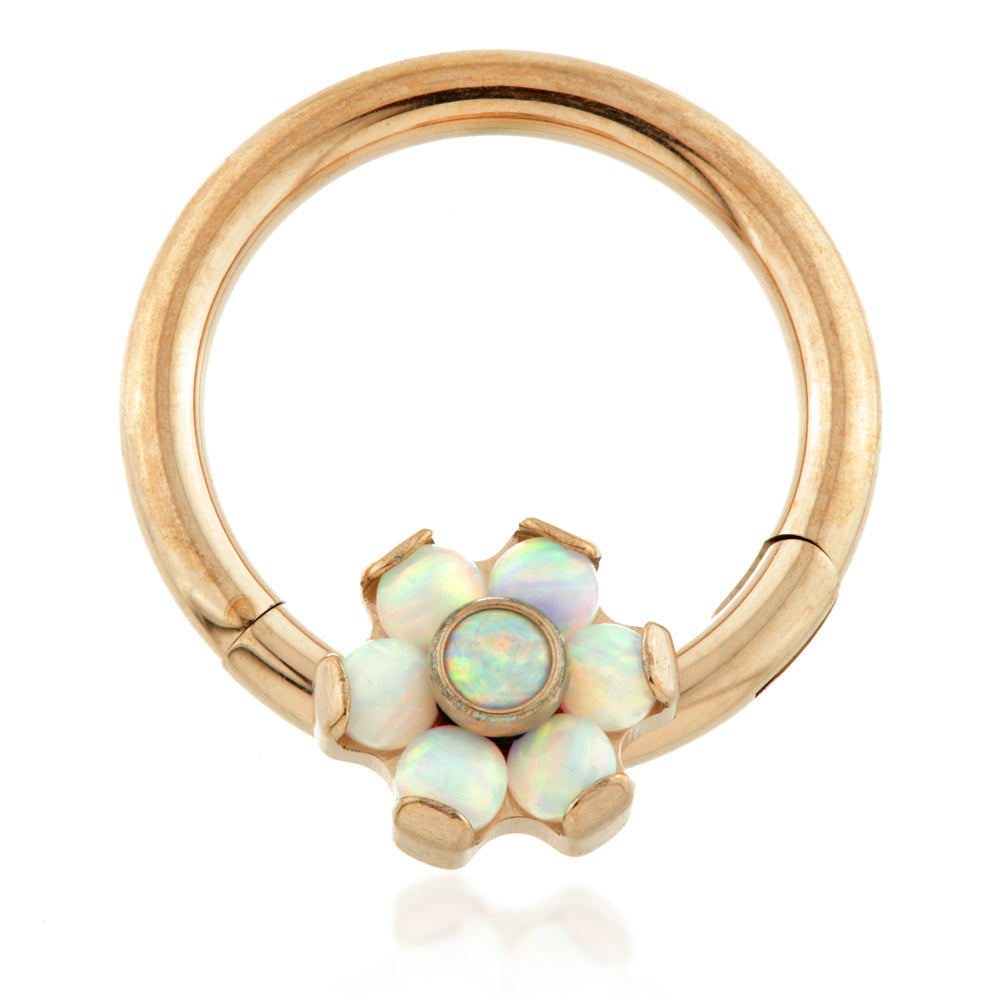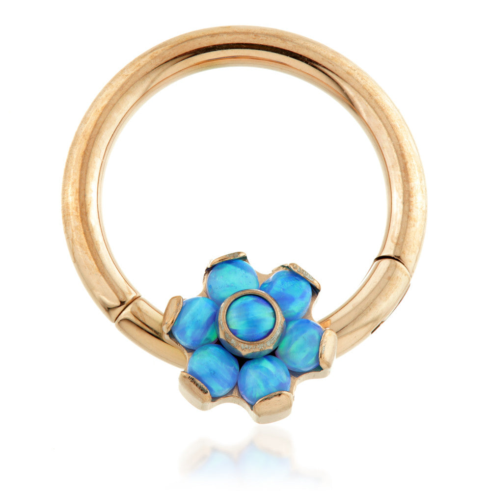 Rose Gold PVD Titanium Forward Facing Opal Flower Hinged Segment Ring Gauge: 1.2mm Size: 8mm White or Blue Opal Medical Grade Titanium 6Al-4VEli ASTM:F-136