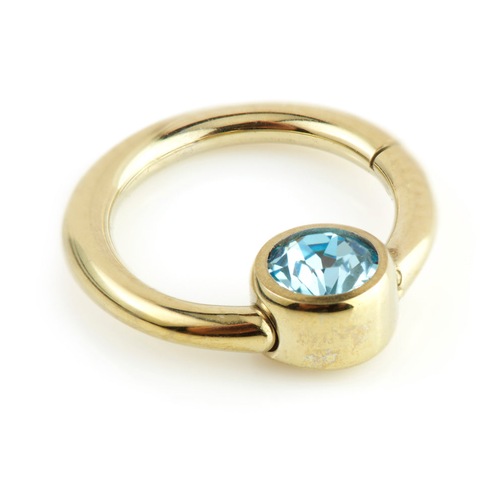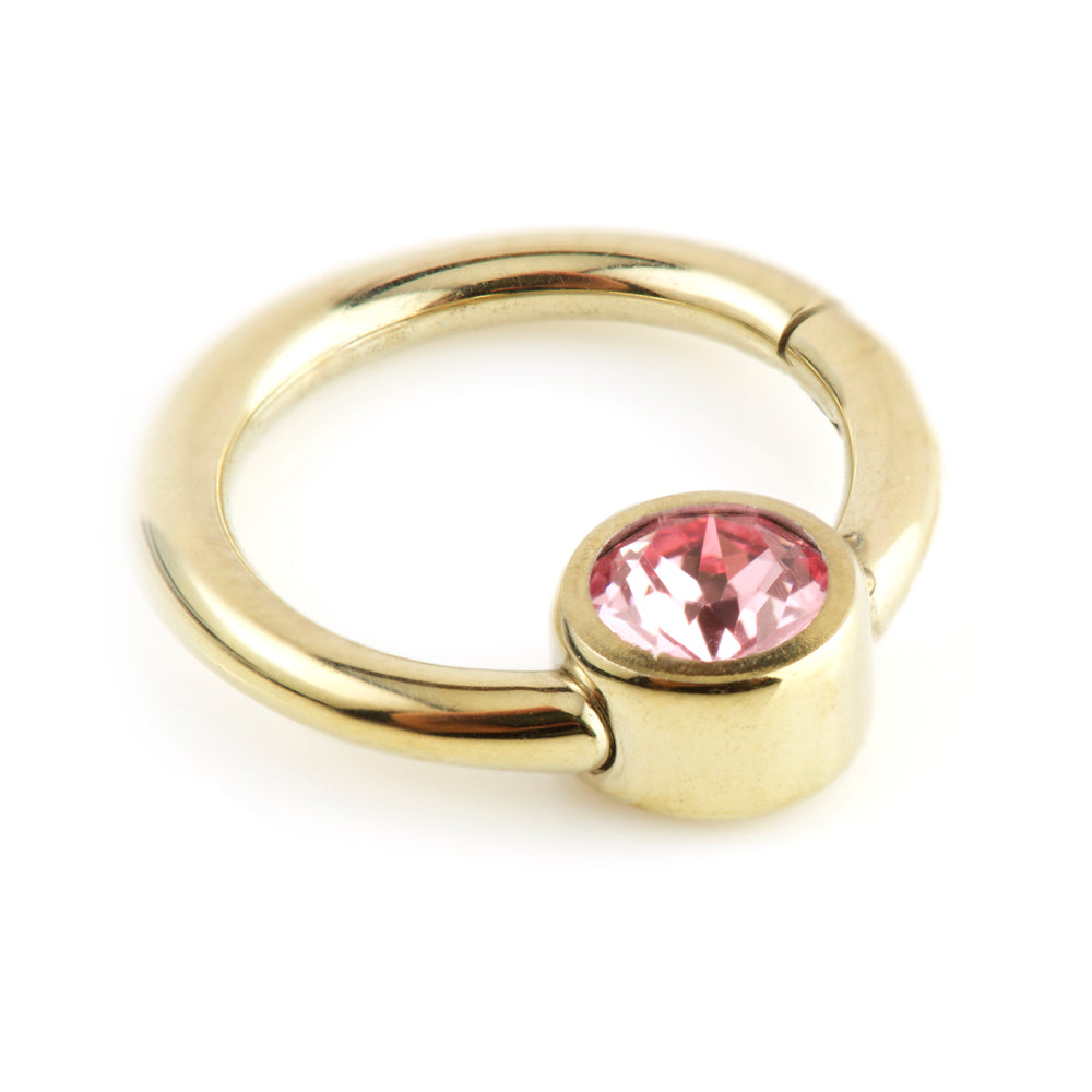 Rose Gold PVD Coating on Titanium Hinge Segment Ring with Rose Gold Titanium Gem Disk Swarovski Gems in Crystal, Lt Rose, Aqua and AB Crystal Size: 1.2mm x 8mm Disk Size: 4mm Medical Grade Titanium 6Al-4VEli ASTM:F-136