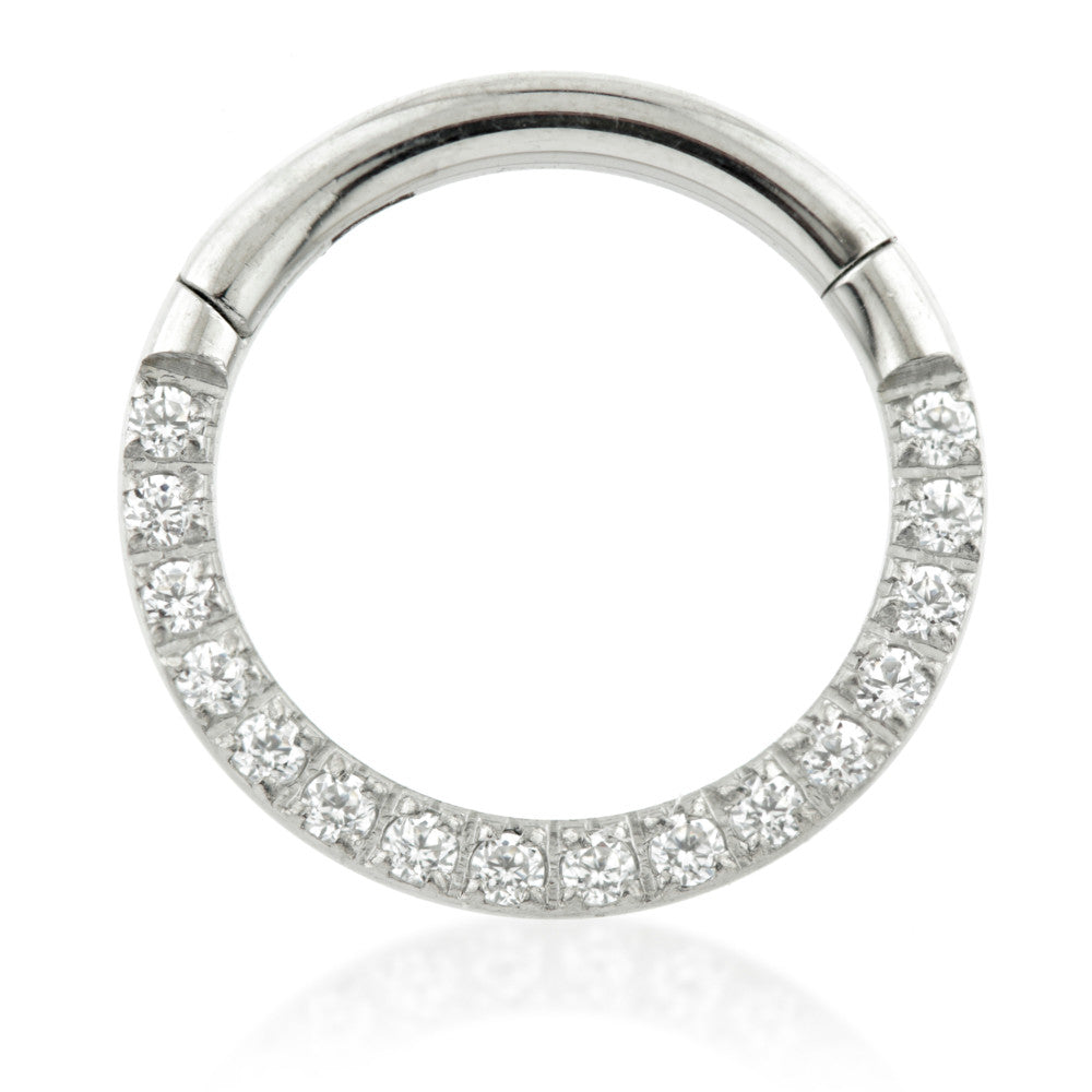 Steel Forward Facing Pave Gems Hinged Daith / Septum Ring Gem Colour: Crystal Sizes: 1.2mm x 6mm, 8mm, 10mm 6mm: 10 x CZ Stones 8mm: 15 x CZ Stones 10mm: 20 x CZ Stones