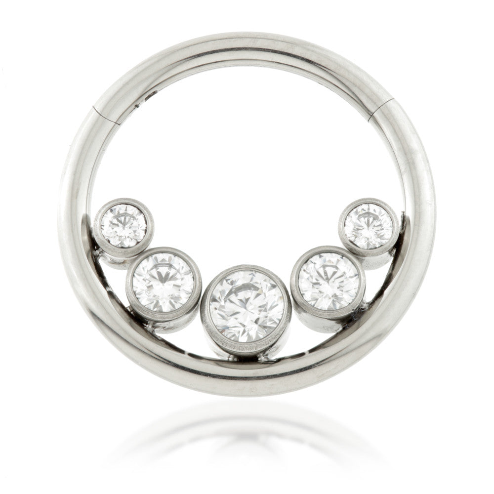 Titanium Front Facing 5 Gem Hinged Ring Gauge: 1.2mm Size: 10mm Gem Colour: CR CZ Gem Colours Medical Grade Titanium 6Al-4VEli ASTM:F-136
