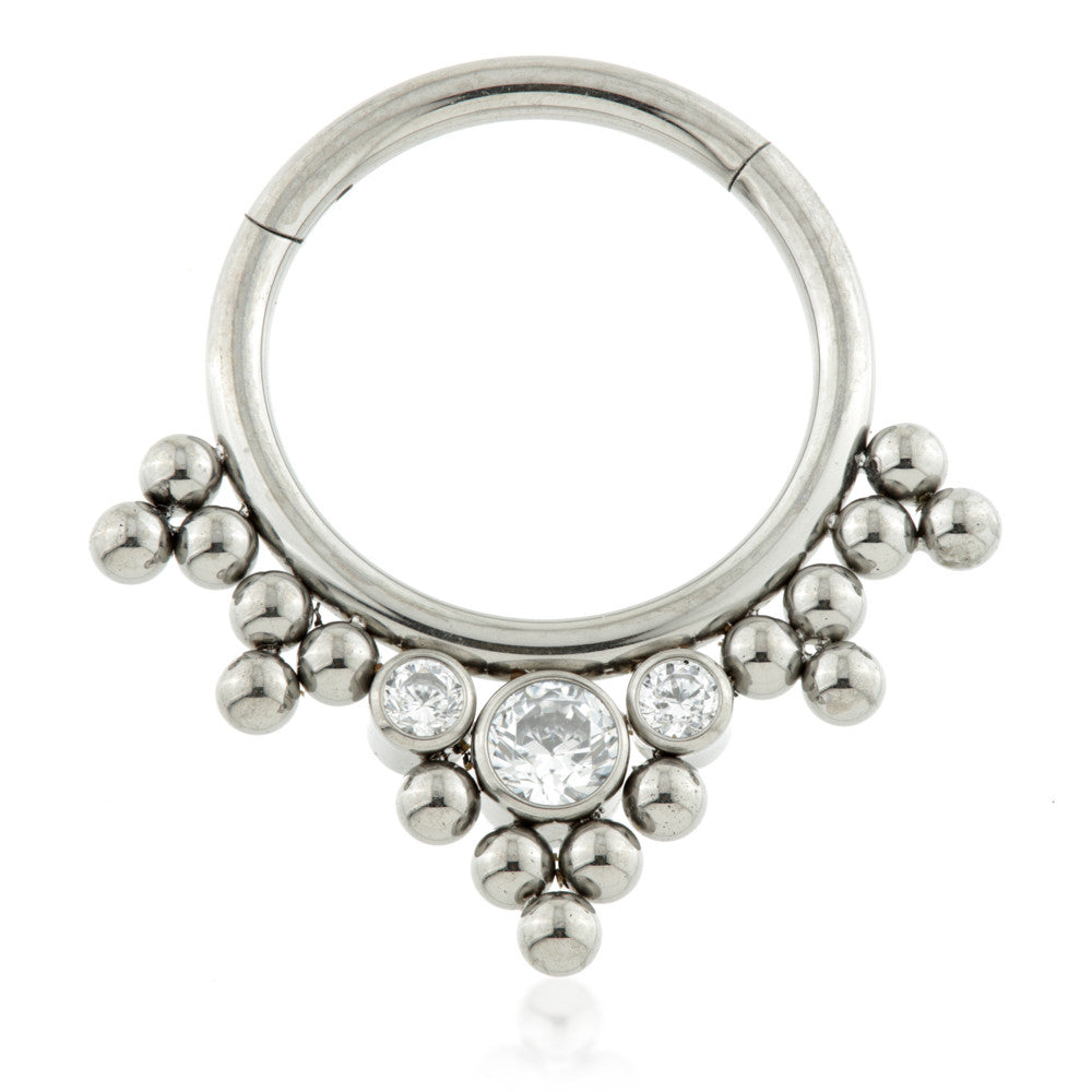 Titanium Front Facing Caeli Gem Cluster Ball Hinged Ring Gauge: 1.2mm Sizes: 8/10mm Gem Colours: CR CZ Gem Stones Medical Grade Titanium 6Al-4VEli ASTM:F-136