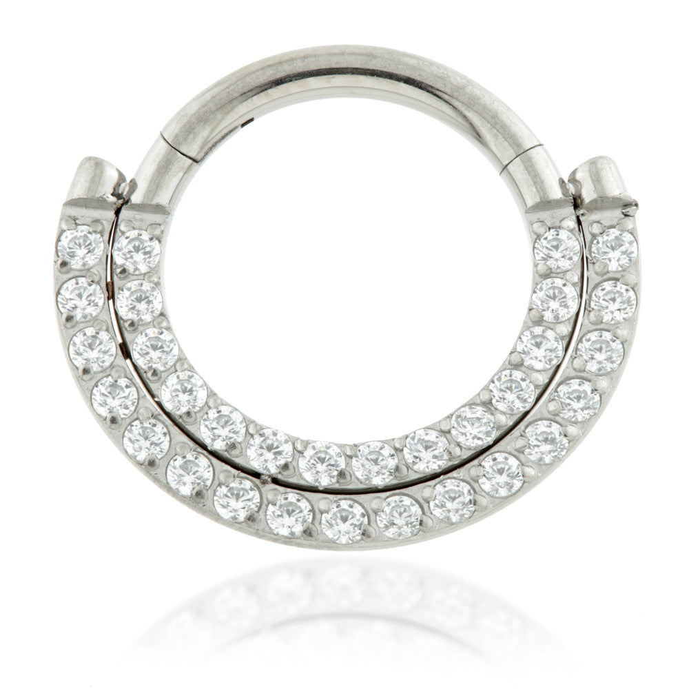 Titanium Forward Facing Double Pave Gem Hinged Daith/Septum Ring Gauge: 1.2mm Sizes: 8/10mm Gem Colours: CR CZ Gem Stones Medical Grade Titanium 6Al-4VEli ASTM:F-136