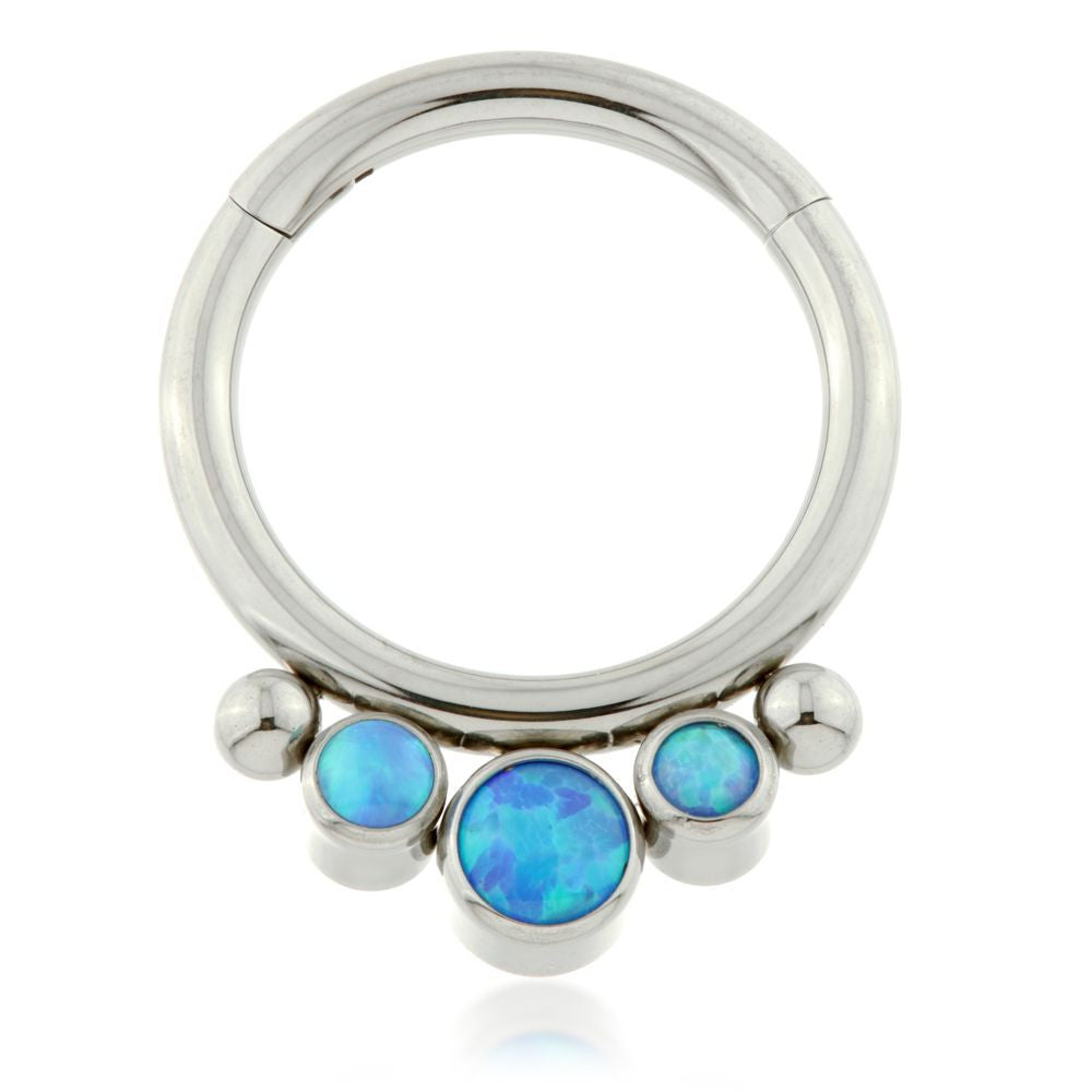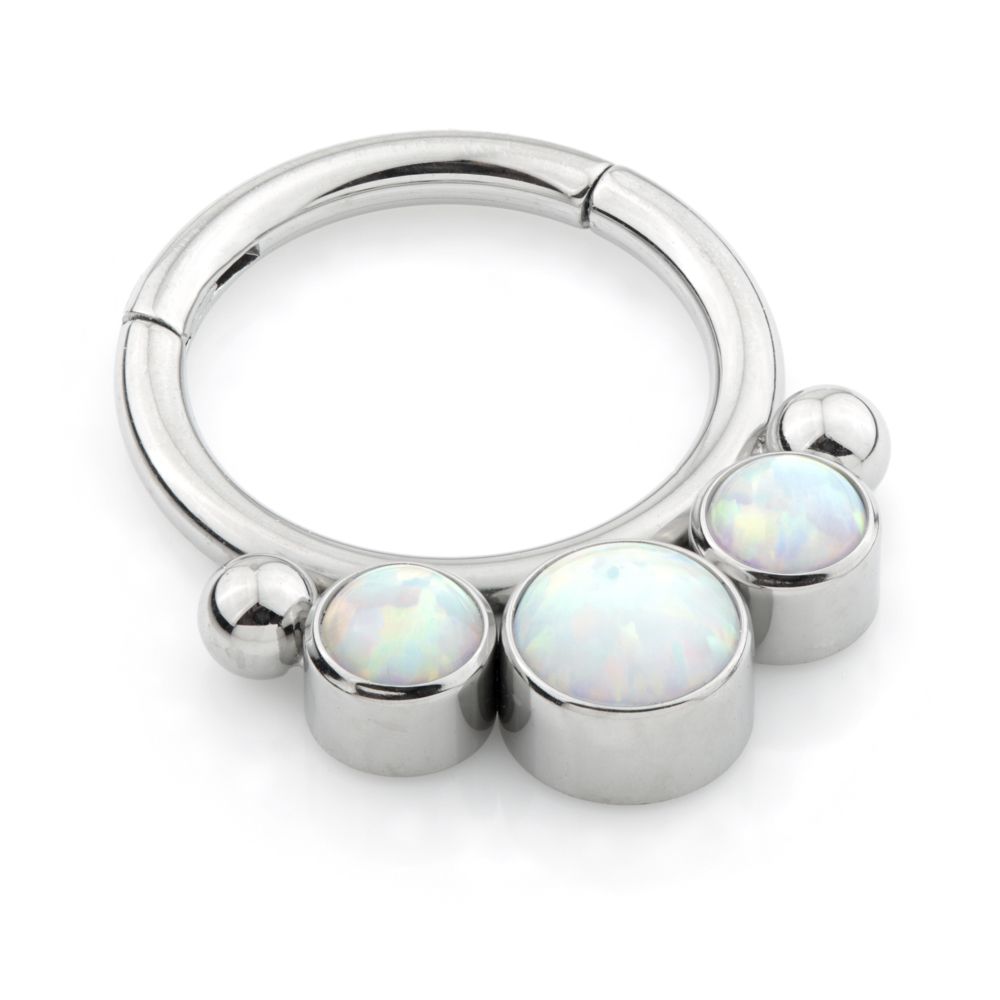 Titanium Front Facing Triple Bezel Opal Hinged Ring Gauge: 1.2mm Sizes: 8mm Opal Colours: BL, WT Synthetic Opal Stones Medical Grade Titanium 6Al-4VEli ASTM:F-136