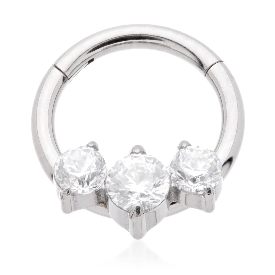 Ti Couture Front Facing Triple Gem Hinged Ring Gauge: 1.2mm Size: 8mm Gem Colour: Crystal Medical Grade Titanium 6Al-4VEli ASTM:F-136