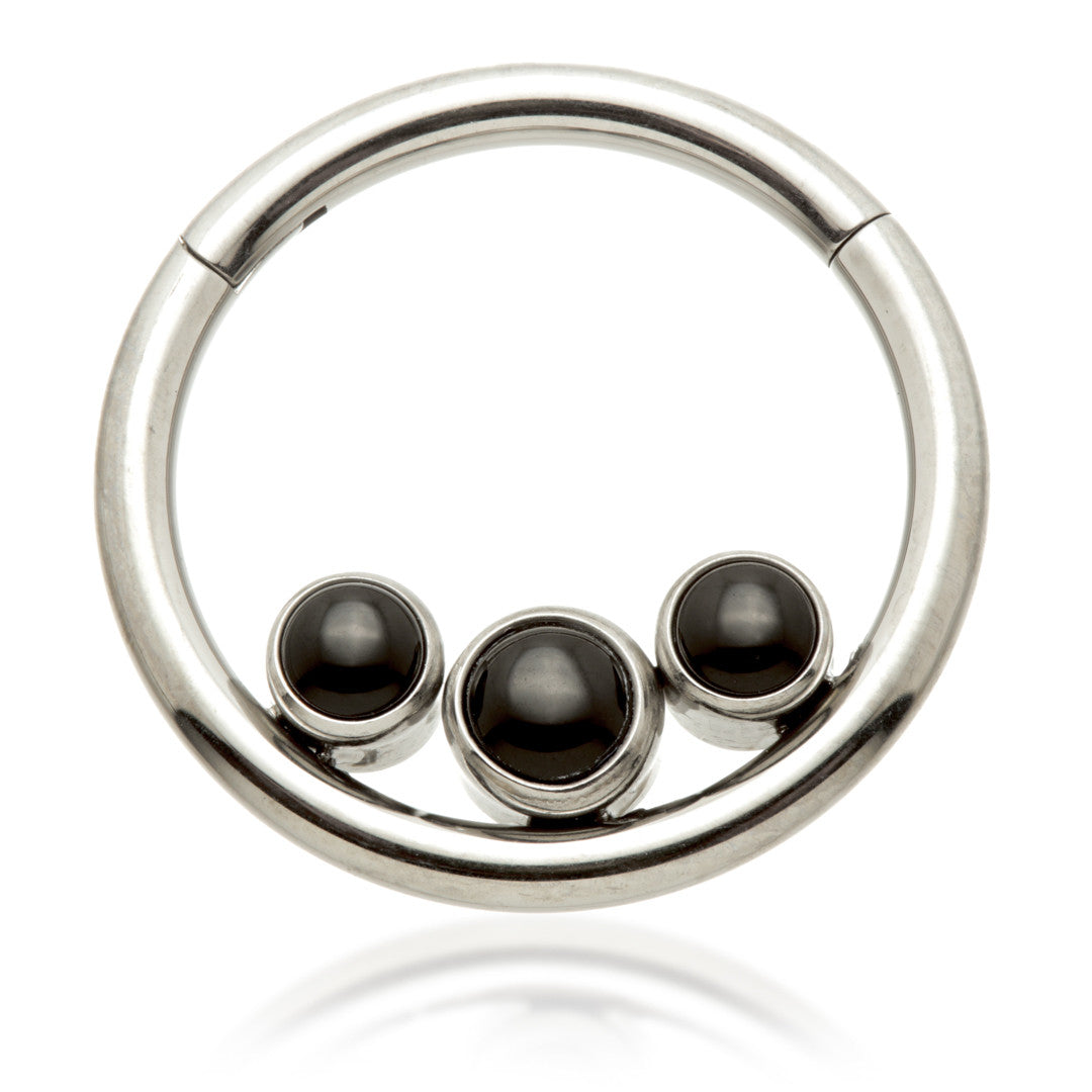 <p>Titanium Triple Inside Bezel with Black Agate Stone Hinged Ring</p> <p>Gauge: 1.2mm<br> Sizes: 8/10mm<br> Stone: Black Agate</p> <p>Medical Grade Titanium 6Al-4VEli ASTM:F-136</p>