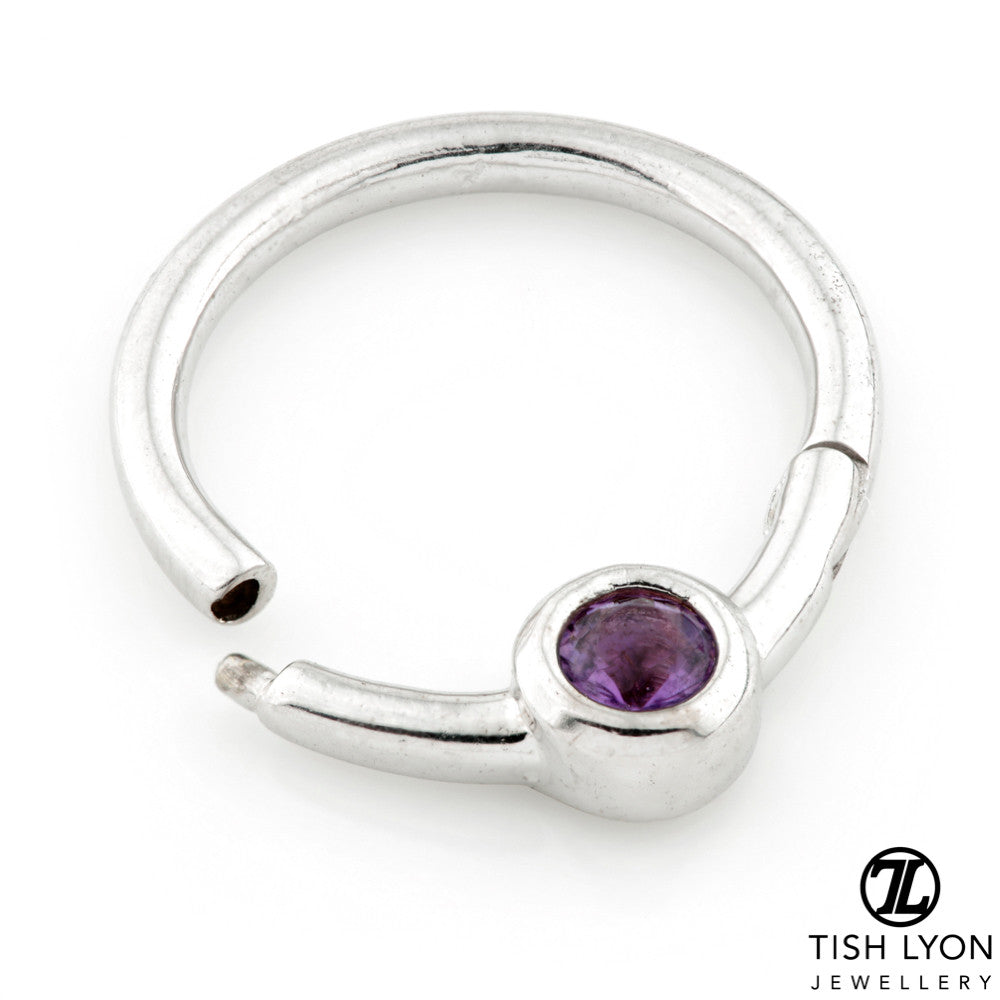 TISH LYON® - Round Amethyst Stone Daith Gold Hinge Ring 14ct White Gold 3mm Amethyst (Natural Stone) Size: 1.2mm x 8mm Packaged in small grey presentation box Suitable for initial piercing (autoclave on coolest heat) Laser Mark - 14K TL