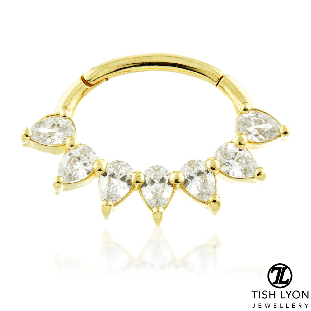 TISH LYON® - Multi Pear Shape Swarovski Jewelled Daith Ring Yellow Gold - 18ct Size: 1.2mm x 6mm Packaged in small grey presentation box Suitable for initial piercing