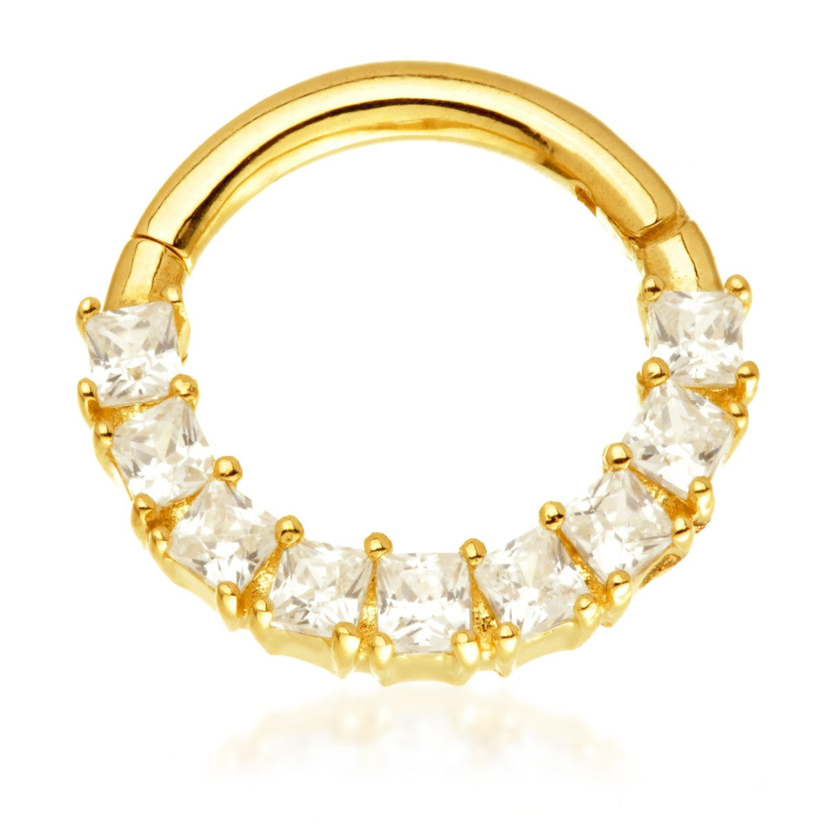 TISH LYON® - Gold TL - Gold Front Facing Princess Cut Cluster Hinge Ring 14ct Solid Gold Gold Colour: Yellow Gauge: 1.2mm Size: 8mm Packaged in small grey presentation box