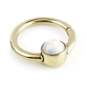 Gold PVD on Steel Hinge Segment Ring with Flat Opal Disk Ideal for Smiley Piercing and ears Size: 1.2mm x 8mm Disk Size: 4mm Colour: White