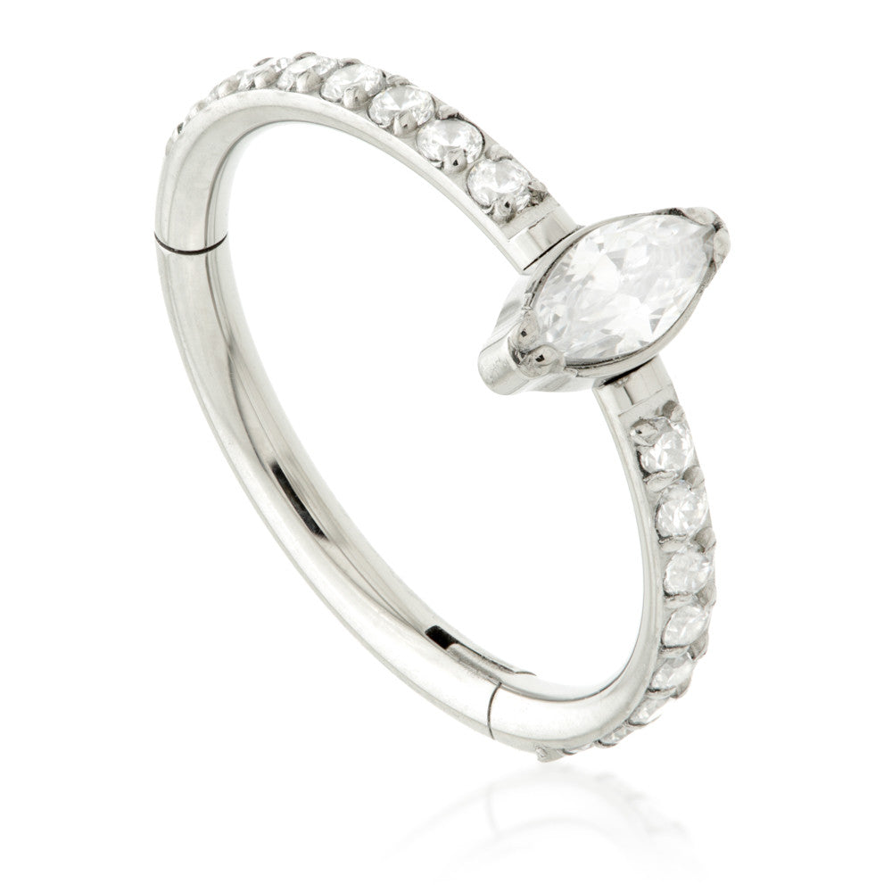 Titanium Pave with Gem Marquise Hinged Ring Gauge: 1.2mm Sizes: 8/10mm Gem Colours: CR CZ Gem Stones Medical Grade Titanium 6Al-4VEli ASTM:F-136