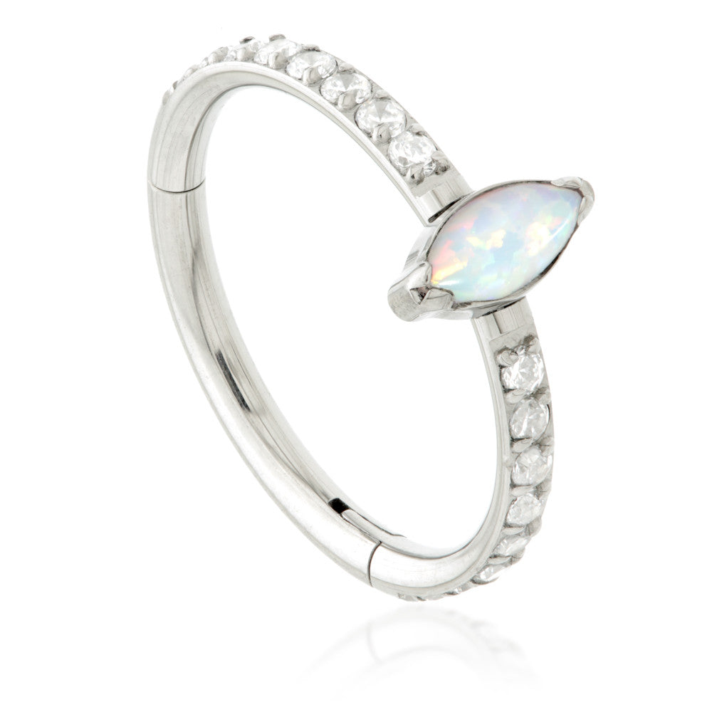 Titanium Pave with Opal Marquise Hinged Ring Gauge: 1.2mm Sizes: 8/10mm Opal Colours: White Medical Grade Titanium 6Al-4VEli ASTM:F-136