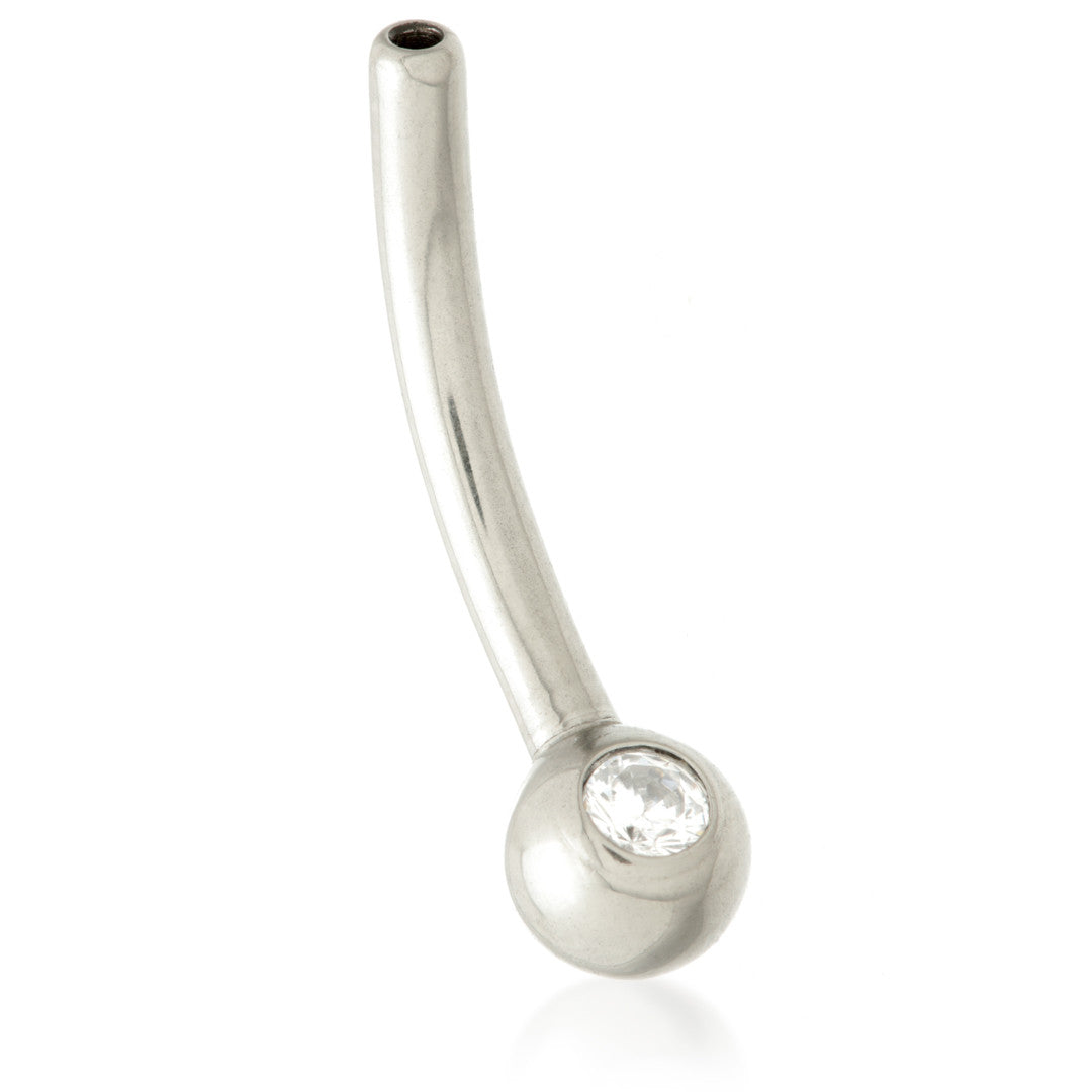 Titanium Threadless Micro Banana Stem with Fixed Gem Ball Gauge: 1.2mm Sizes: 8mm Gem Size: 2mm Gem Colour: CR Fixed Ball: 3mm CZ Gem Stones Medical Grade Titanium 6Al-4VEli ASTM:F-136