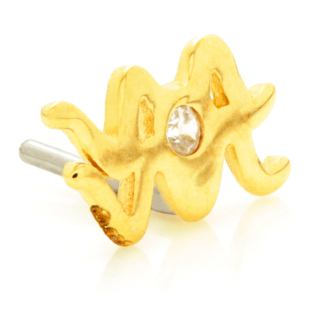 TISH LYON® 14ct Solid Gold Threadless Jewelled Zodiac Aquarius Pin Attachment Gauge: 1.0/1.2/1.6mm (0.5mm threadless) Size: 3.5mm x 6mm Gem Colour: CR CZ Gem Stones Suitable for initial piercing Packaged in small grey presentation box