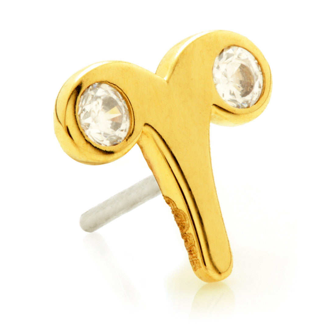 TISH LYON® 14ct Solid Gold Threadless Jewelled Zodiac Aries Pin Attachment Gauge: 1.0/1.2/1.6mm (0.5mm threadless) Size: 5mm x 5.5mm Gem Colour: CR CZ Gem Stones Suitable for initial piercing Packaged in small grey presentation box