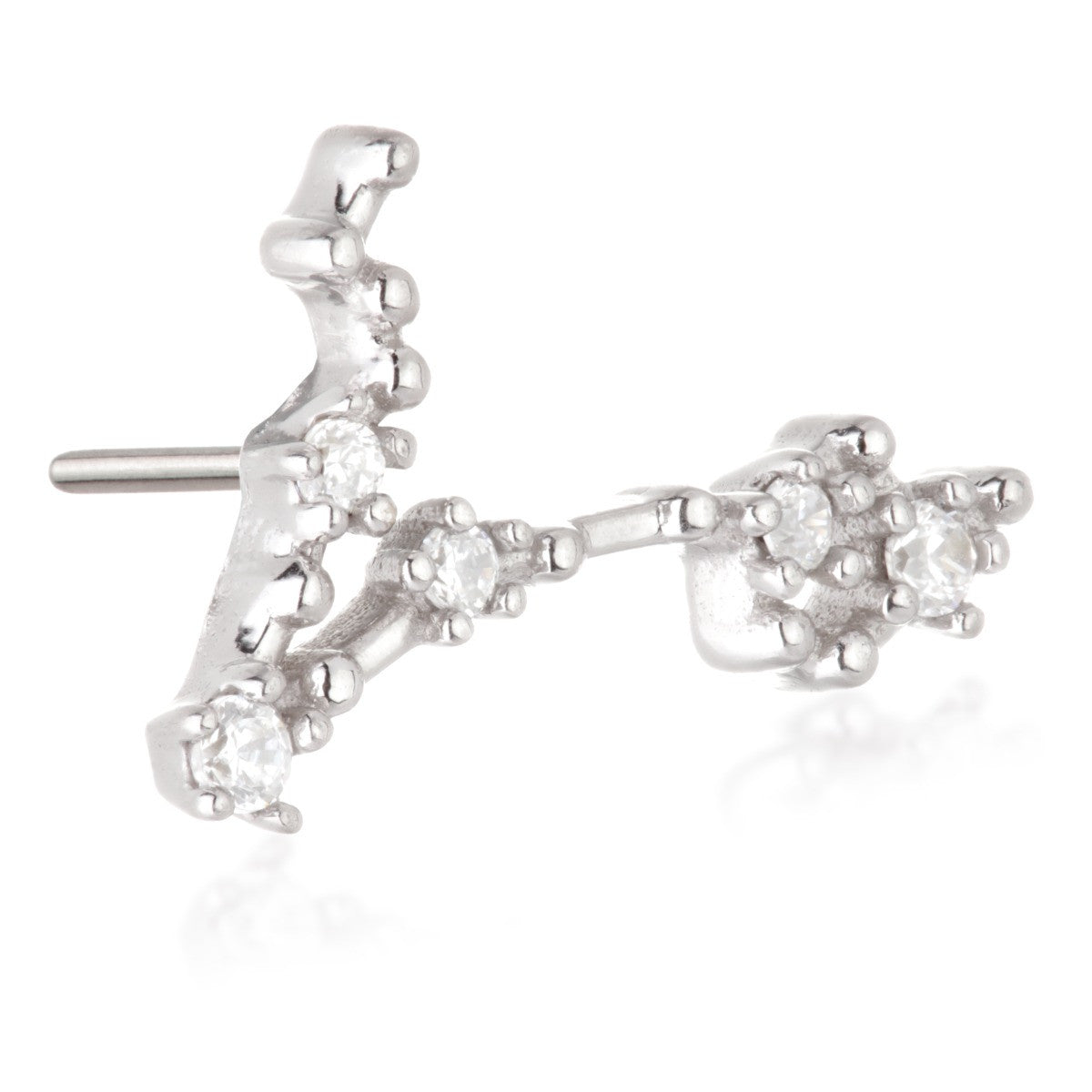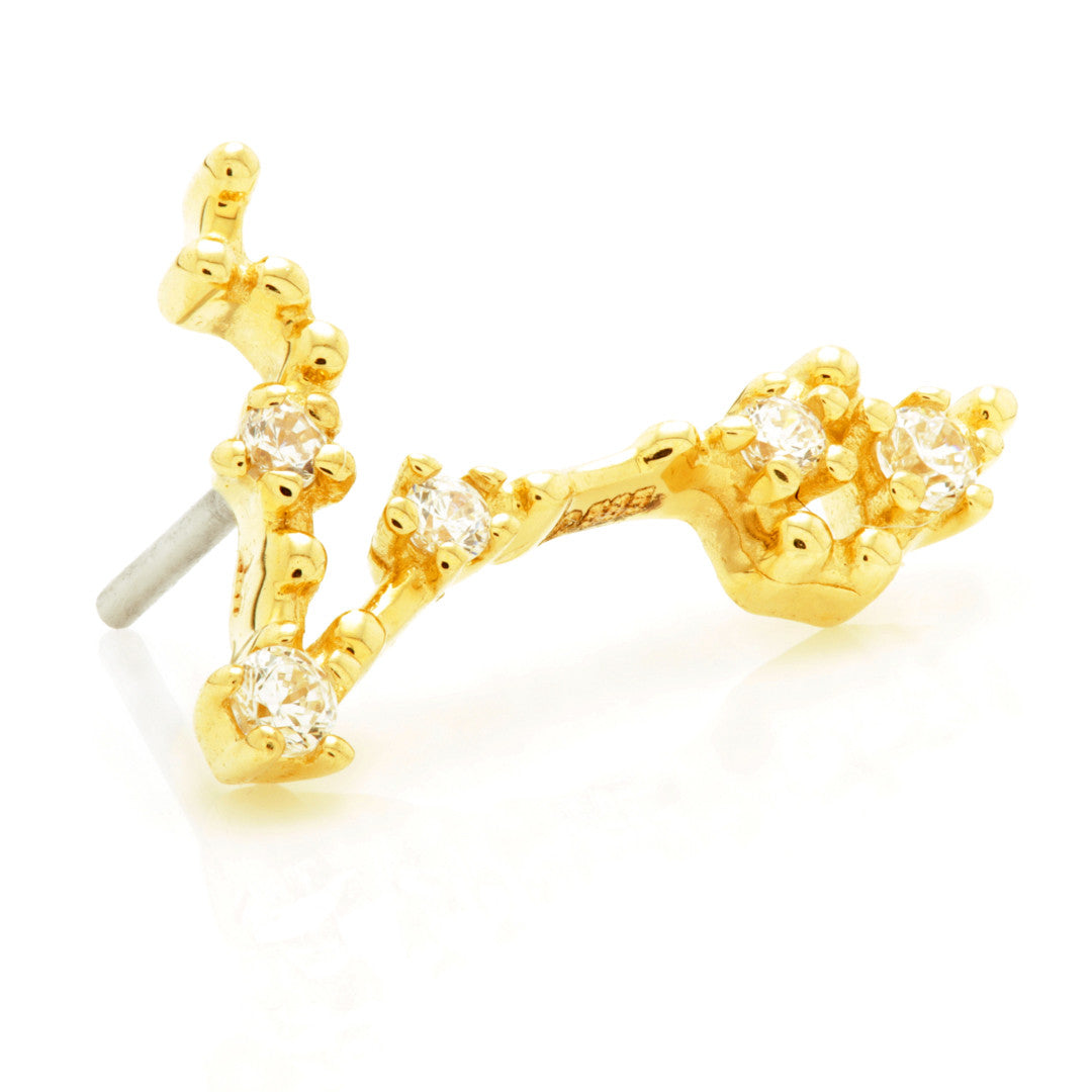 TISH LYON® 14ct Solid Gold Threadless Jewelled Zodiac Pisces Constellation Pin Attachment Gauge: 1.0/1.2/1.6mm (0.5mm threadless) Size: 7mm x 11mm Gem Colour: CR CZ Gem Stones Suitable for initial piercing Packaged in small grey presentation box
