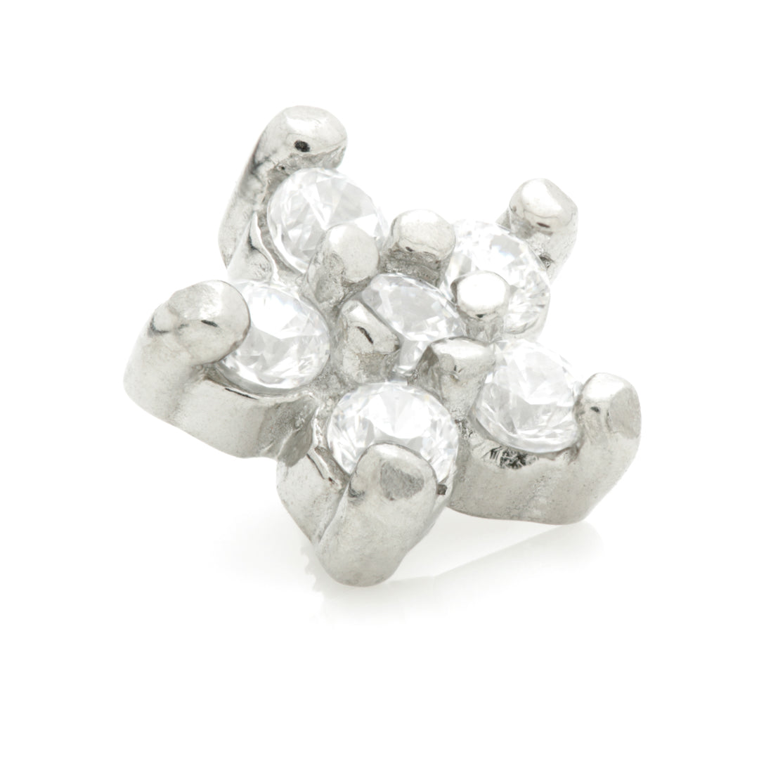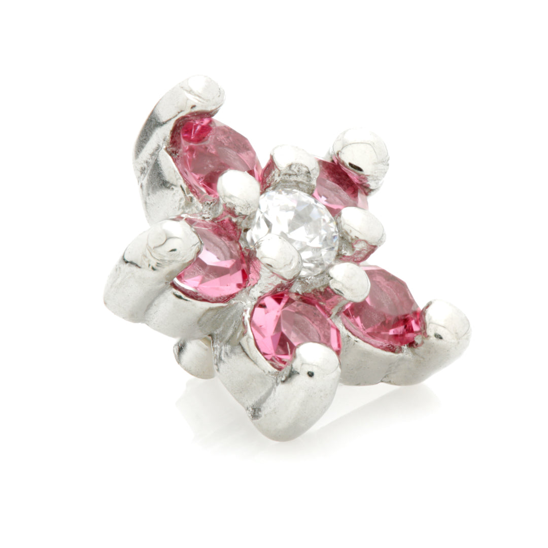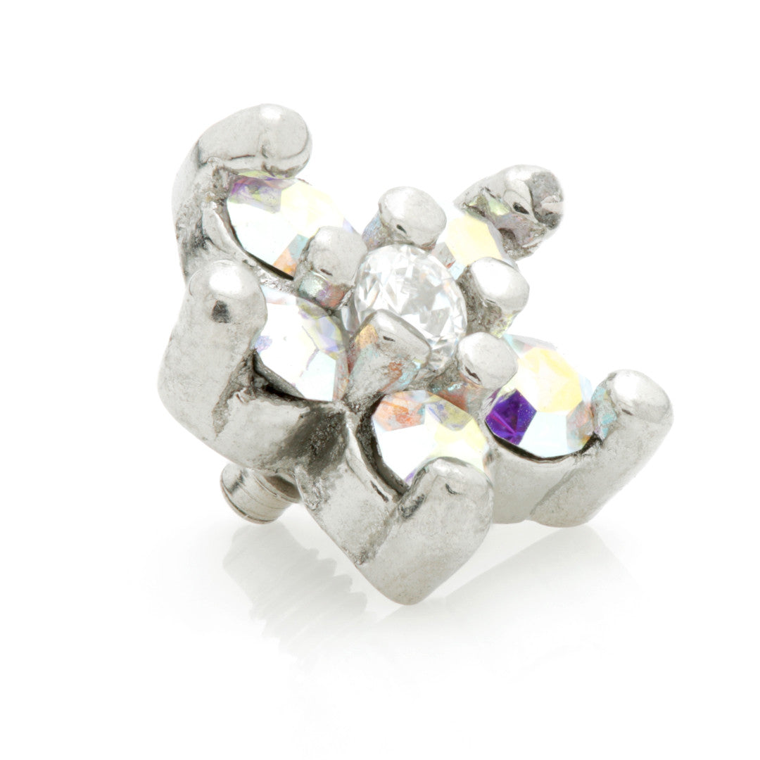 Gem Steel Flower (5 Petals) to fit onto 1.6mm internal thread titanium dermal anchor base Gauge: 1.6mm Disk Size: 6mm or 10mm Gem Colour: Crystal, Aqua, AB, Rose, Jet, Peridot, Lt Siam