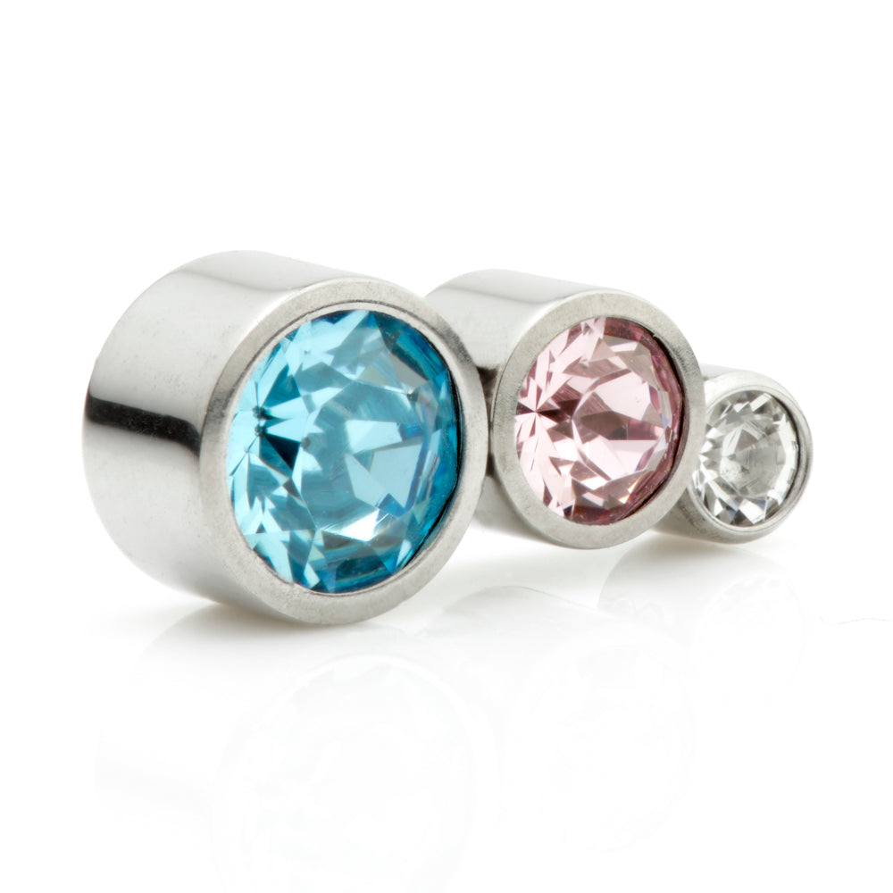 Titanium Flower with Graduated Jewels Gauge 1.2mm with 0.9mm thread Gem Colours: Aqua (4mm), Light Amethyst (3mm) & Crystal (2mm) Gems Swarovski Crystal Gem Stones Curve for left or right side Titanium Colours Available Medical Grade Titanium 6Al-4VEli ASTM:F-136