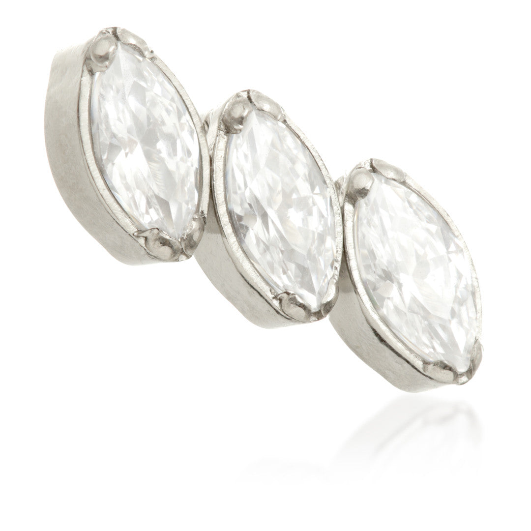 Ti Internal Side Triple Jewelled Marquise Attachment Gauge: 1.2mm (0.9mm thread) Attachment Size: 4mm x 10mm Gem Size: 2mm x 4mm Gem Colour: CR CZ Gem Stones Medical Grade Titanium 6Al-4VEli ASTM:F-136