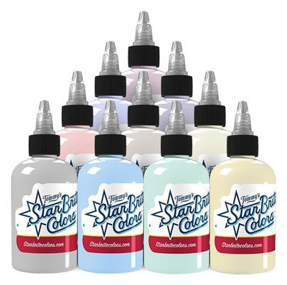 10 x 1oz bottles of https://www.wholesalebodyjewellery.com/tattoo-supplies/product/tattoo-inks/starbrite.html StarBrite Ink . From the manufacturer: Our Soft Pastel colors are a lighter version of our celebrated Pastel tones. These colors do justice when doing magical or whimsical landscape settings. The StarBrite Soft Pastel Palette is comprised of the following colorful shades: Aqua Green Misty Cloud Nautical Purple Peachie Cream Purple Haze Rose Petal Sand Stone Sky Blue Spring Bud Sunbeam