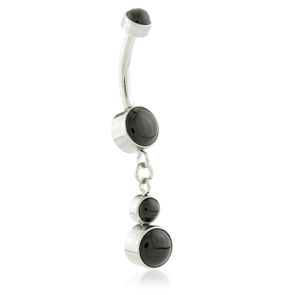 Internal Ti Double Jewelled Disk Navel With Hanging Black Agate Stones Size: 1.6mm x 10/12mm Disk Size: 4mm + 6mm 1.6mm gauge with 1.2mm internal thread Medical Grade Titanium 6Al-4VEli ASTM:F-136