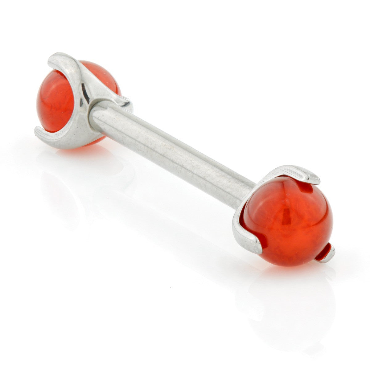 Internal Titanium Nipple Bar with Red Agate Stone Please note, one end is fixed on to the bar and the other is removable. Gauge: 1.6mm Sizes: 12/14/16mm Medical Grade Titanium 6Al-4VEli ASTM:F-136