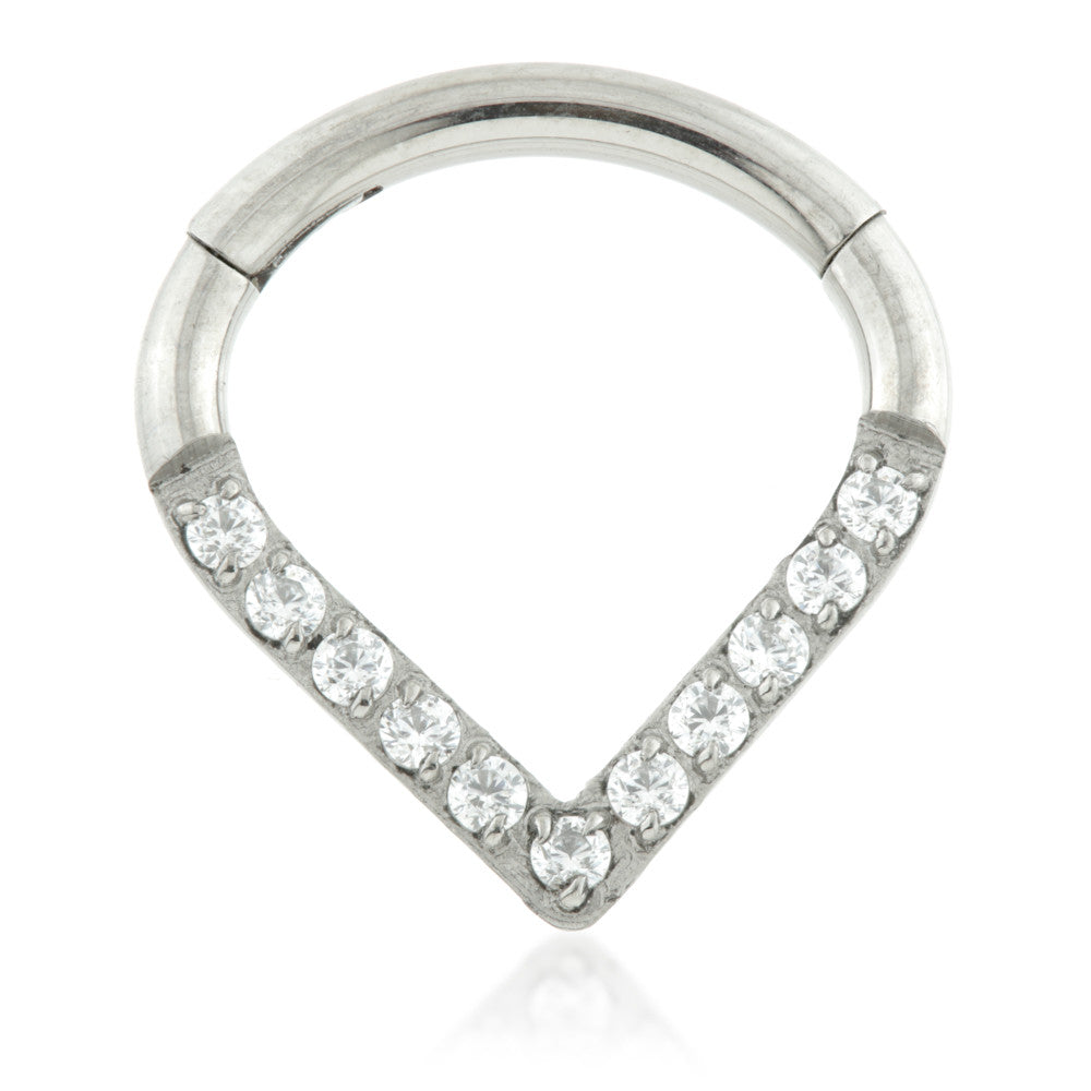 Titanium Front Facing Jewelled Pave Wishbone Hinged Ring Gauge: 1.2mm Sizes: 8/10mm Gem Colours: CR CZ Gem Stones Medical Grade Titanium 6Al-4VEli ASTM:F-136