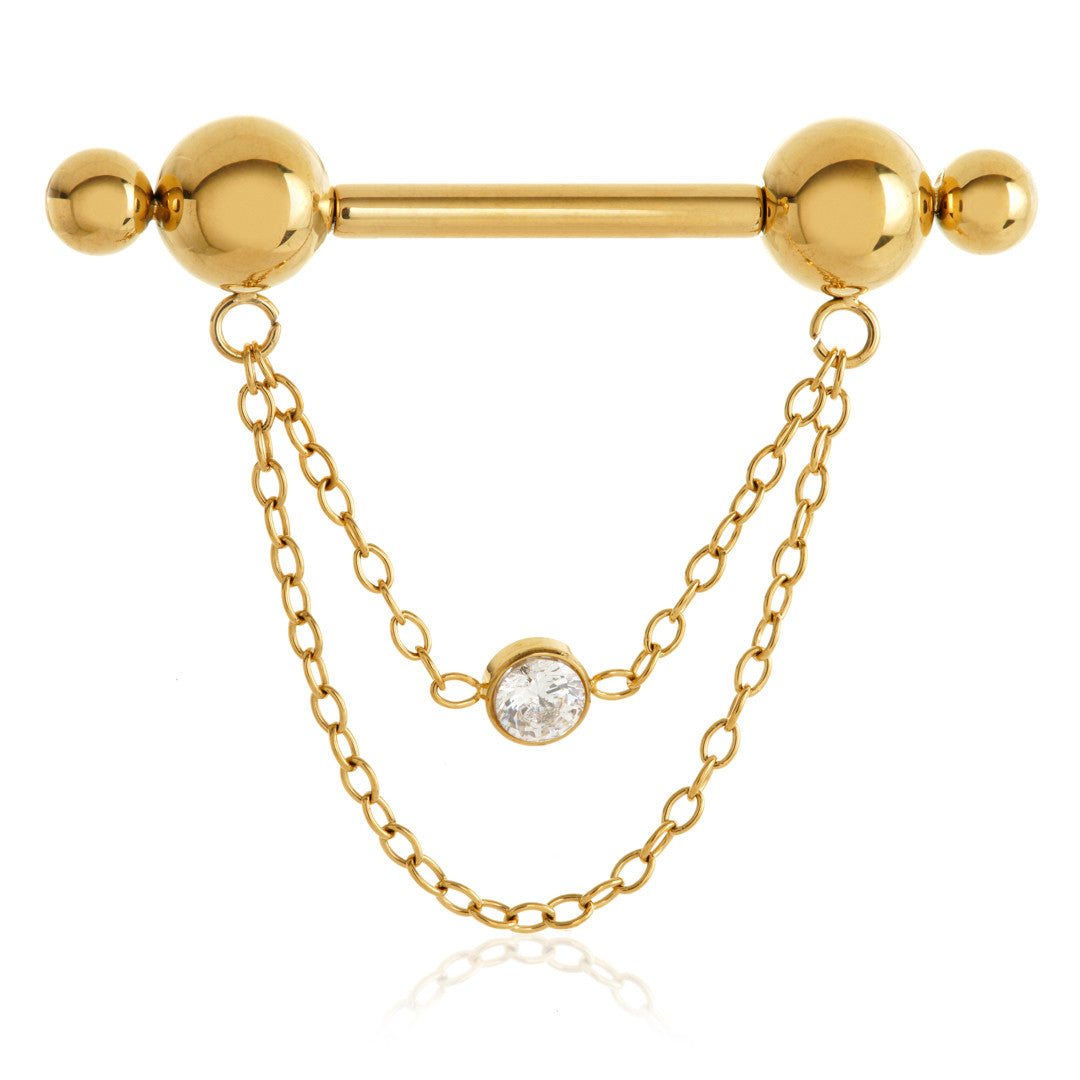 Threadless Zircon Gold Ti Double Ball Jewelled Chain Nipple Bar